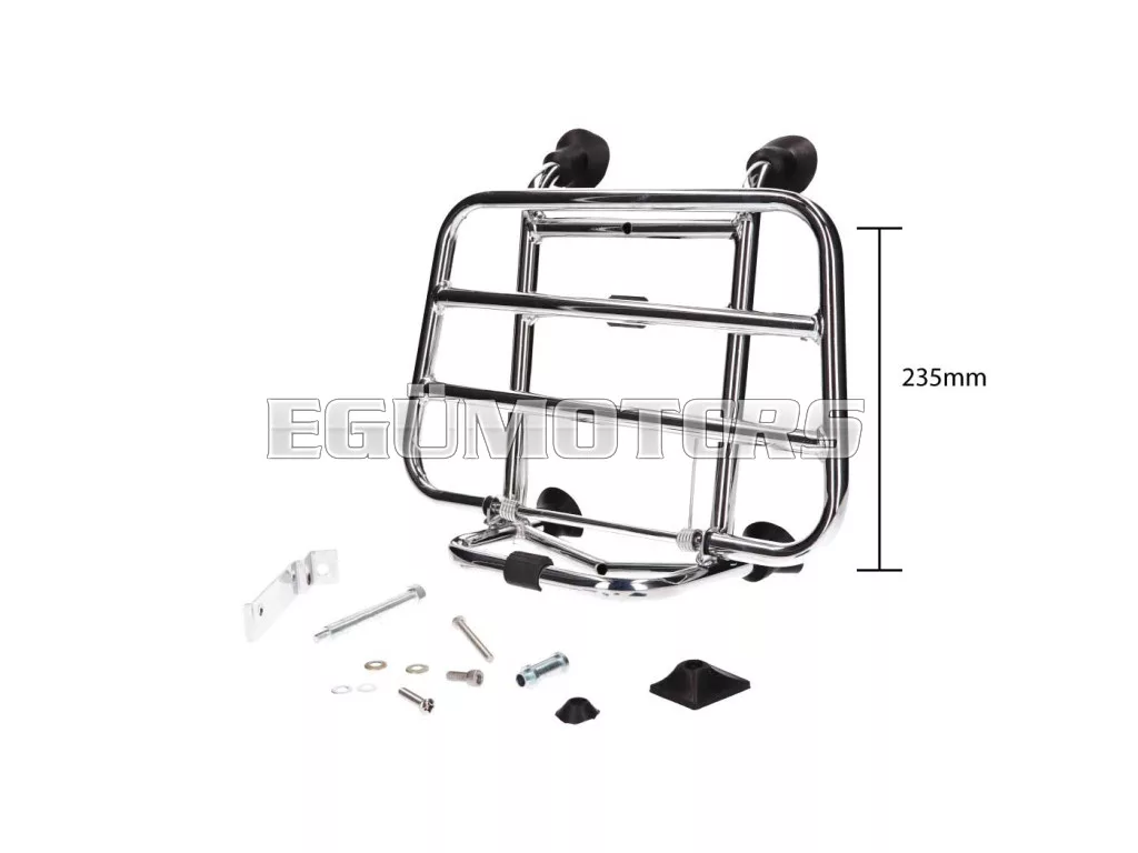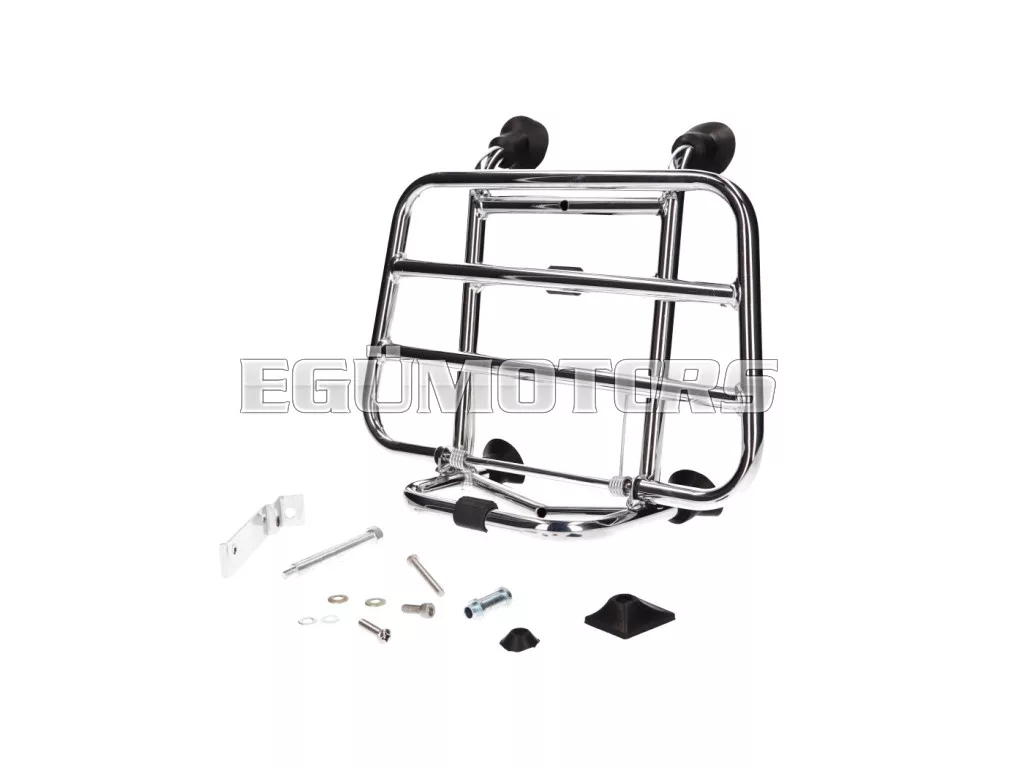 Összecsukható, krómozott első szállítórács, alkalmas Vespa Primavera 50 és 125 cc modellekhez.