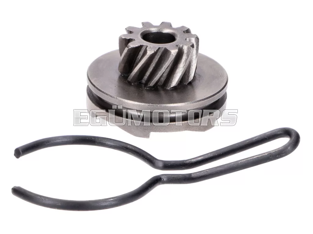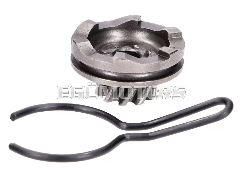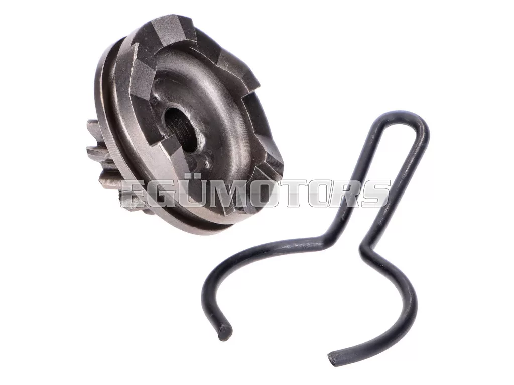 Indító fogaskerék javítókészlet biztosítórugóval, alkalmas fekvő és álló Minarelli motorokhoz, valamint Minarelli alapú 2 ütemű motorokhoz, mint például CPI, Explorer, Keeway, Mawi, Longija (1E40QMB).