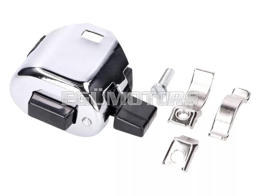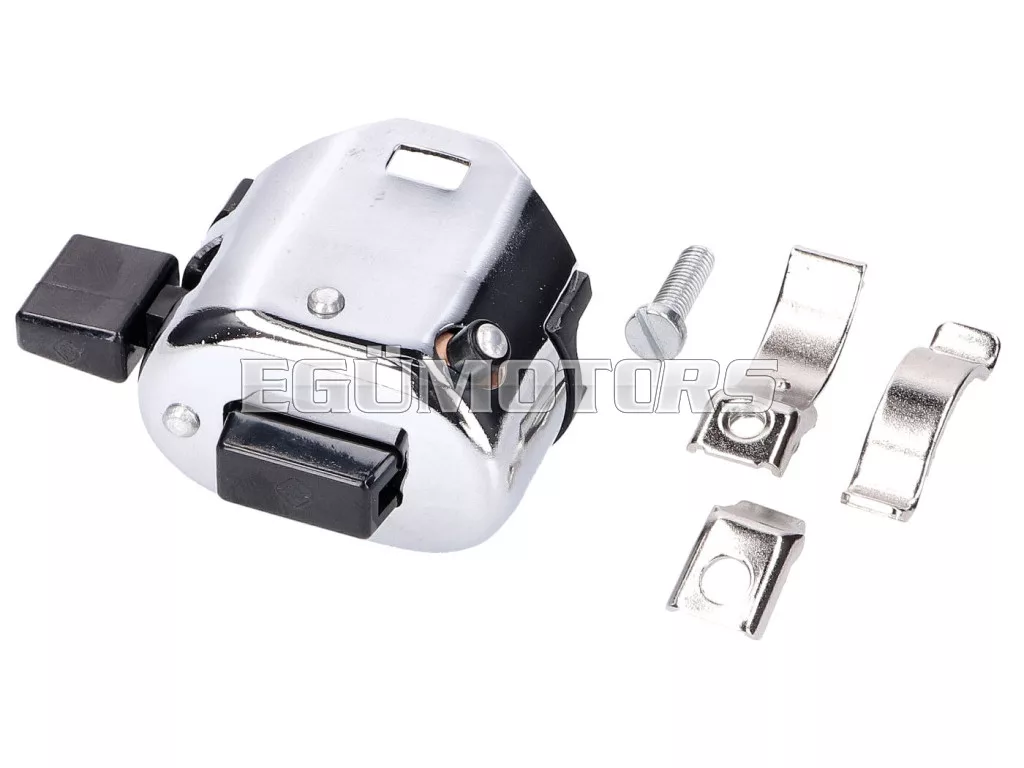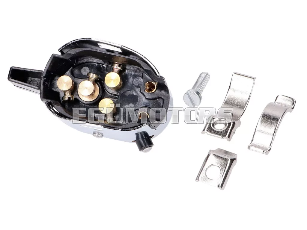 Kormánykapcsoló egység Merit típusú változat, krómozott fém kupakkal, öt funkcióval, különböző mopedekhez.