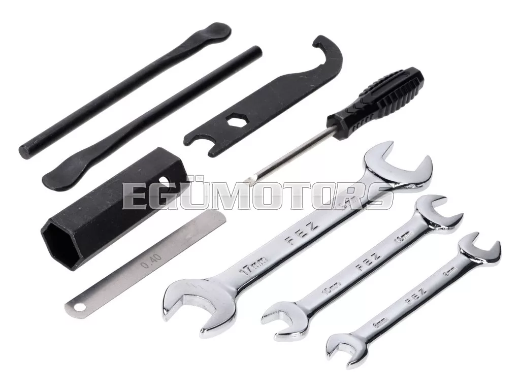 Szerszámkészlet, alkalmas különböző mopedekhez, segédmotoros kerékpárokhoz és mokickhoz, például Zündapp, Kreidler, Hercules, Puch, Miele, DKW, KTM, Rixe és Sachs modellekhez.