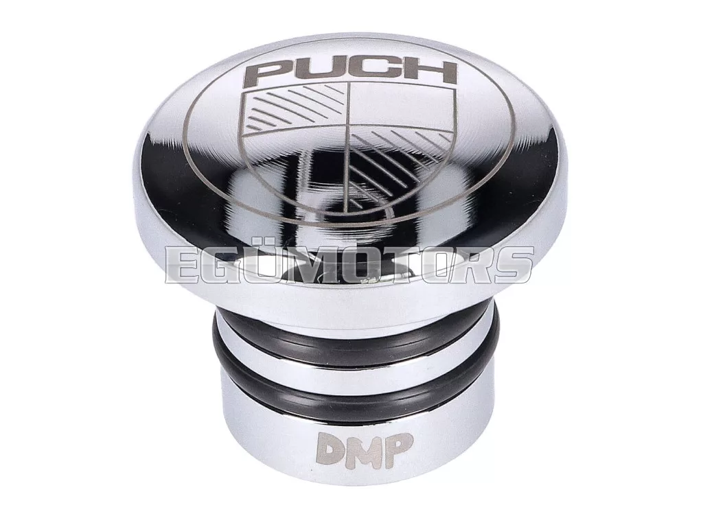 Magas minőségű, polírozott, egyedi rozsdamentes acél benzintank sapka kerek fejjel és lézerrel vágott Puch logóval.