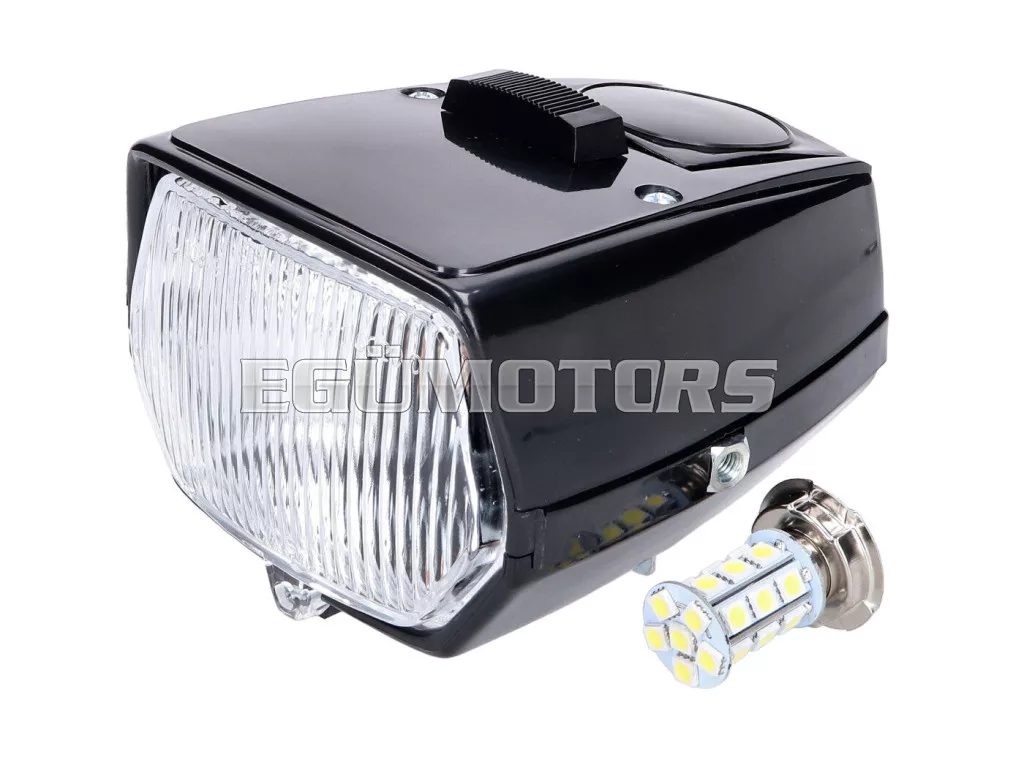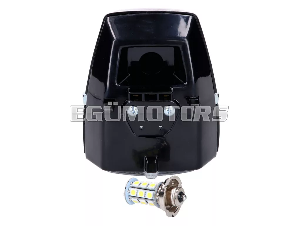 Csere fényszóró, fekete, LED izzóval (P26SLED) és kapcsolóval, levehető sebességmérő / fordulatszámmérő fedéllel.