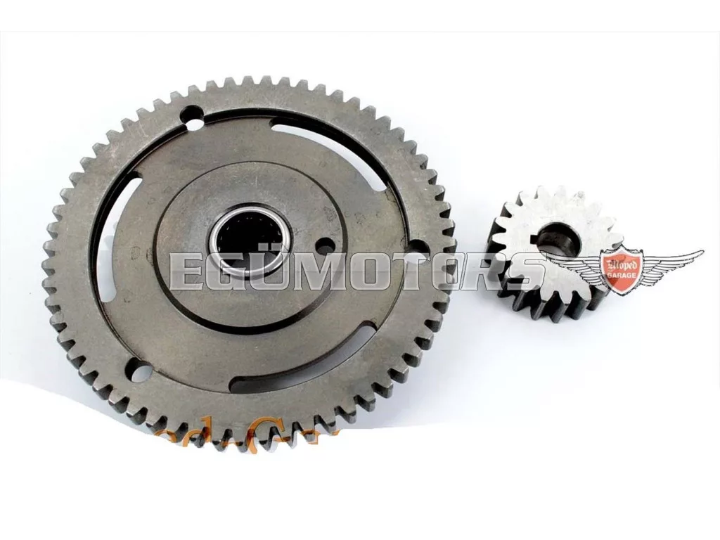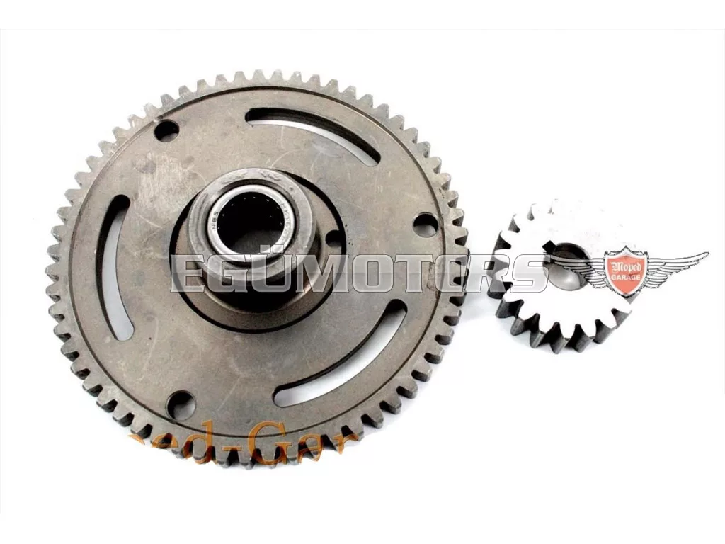 Elsődleges hajtás, amely 19 fogú főtengely fogaskerékből és 61 fogú kuplungkosár tartóból áll, tűgörgős csapággyal.