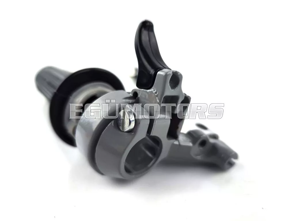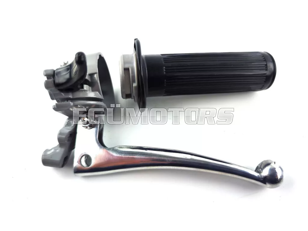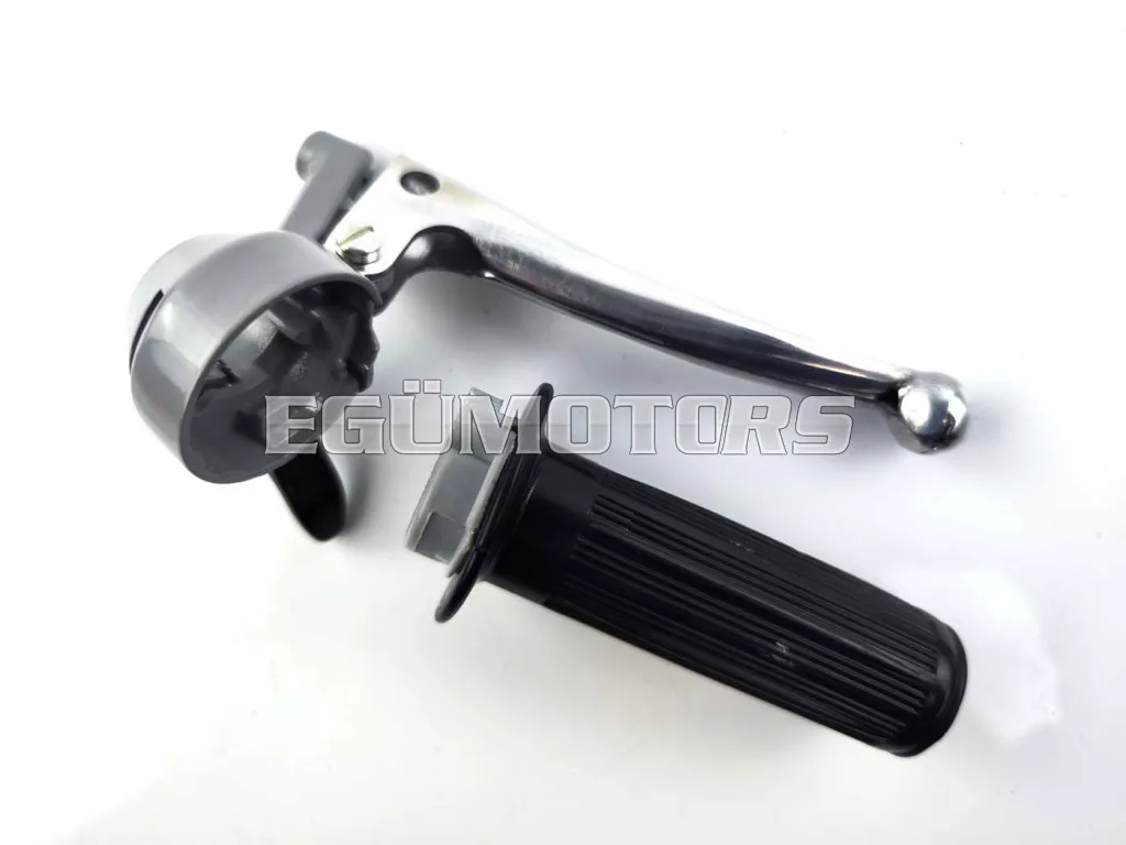 Gázmarkolat szerelvény fekete bordázott gumimarkolattal és alumínium kuplungkarral.