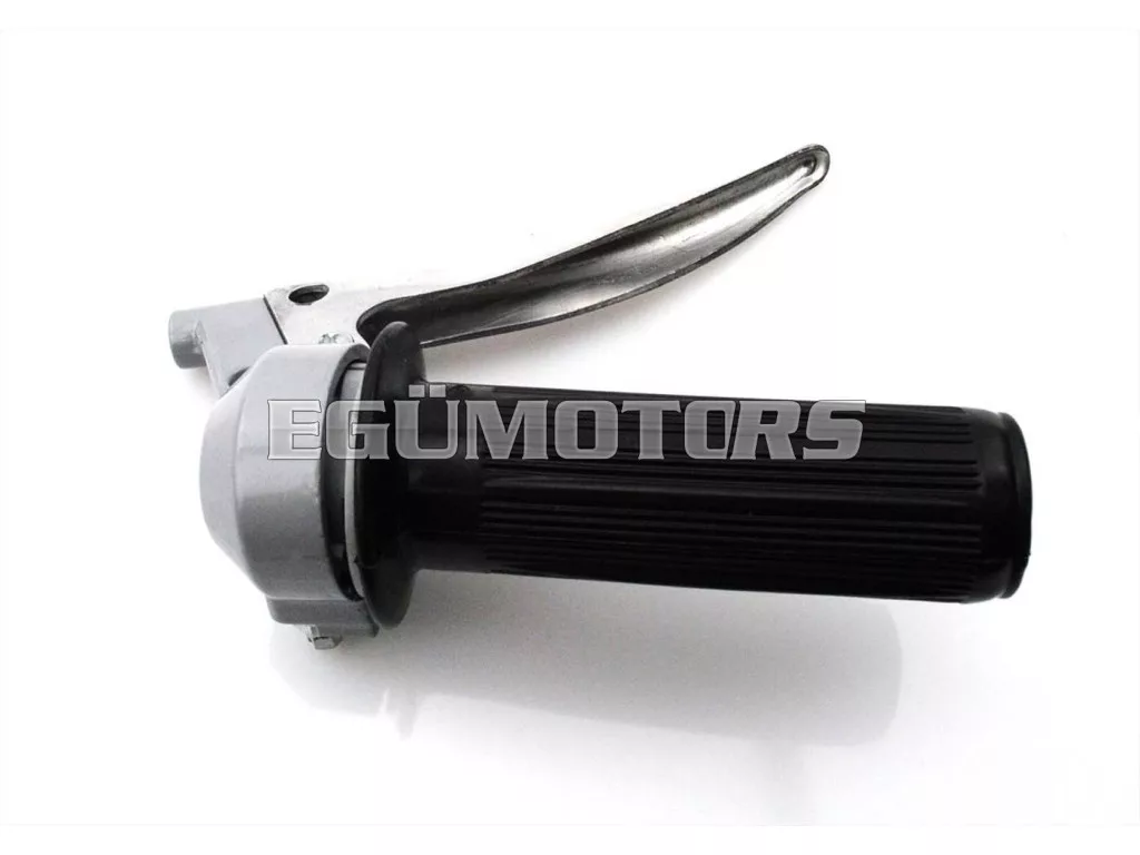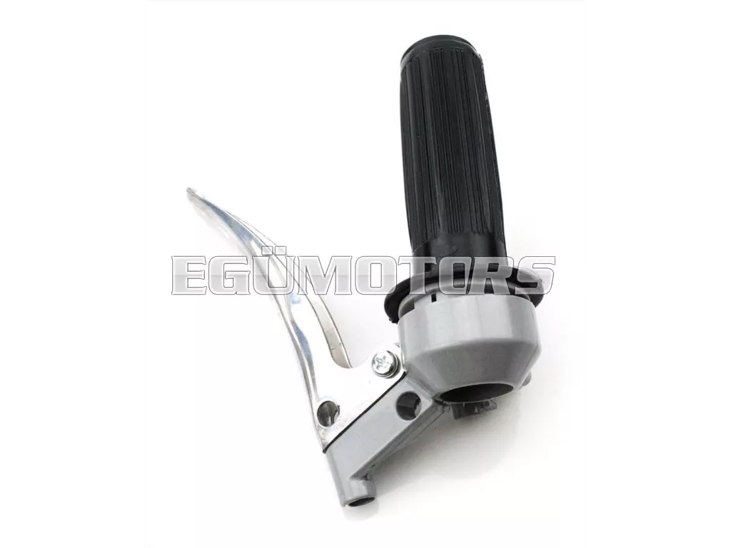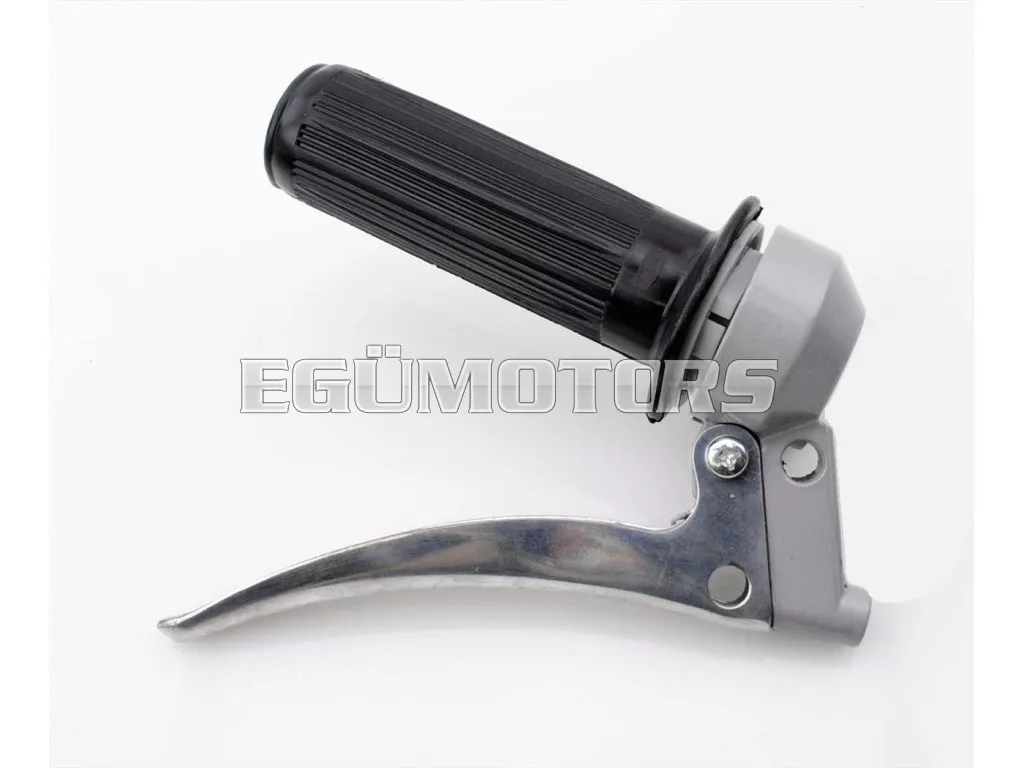 Gázkar szerelvény fekete bordázott gumimarkolattal és alumínium kuplungkarral, régi kivitelben (golyóvég nélkül).
