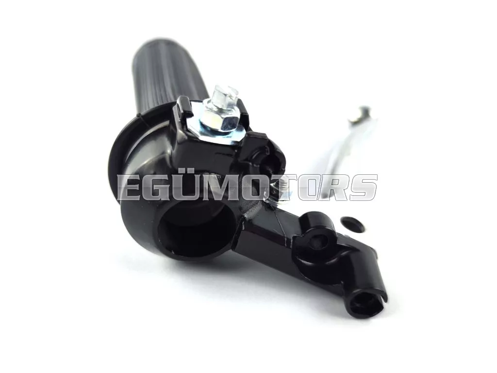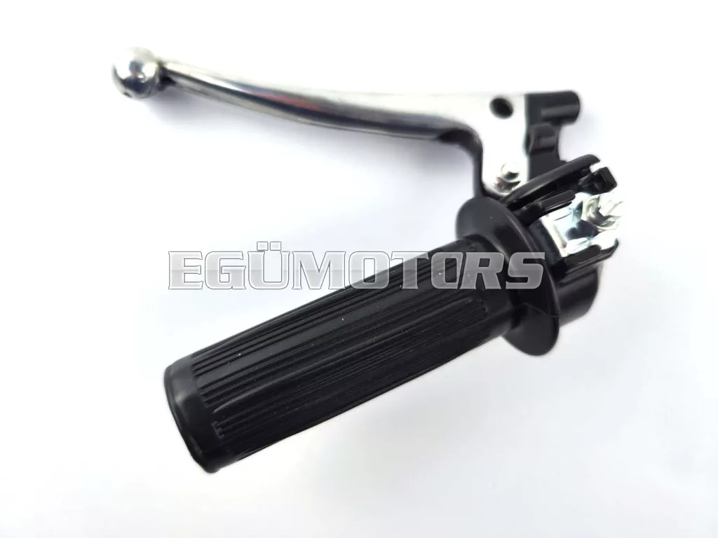 Gázmarkolat szerelvény fekete bordázott gumimarkolattal és alumínium kuplungkarral, golyós végű kivitelben.