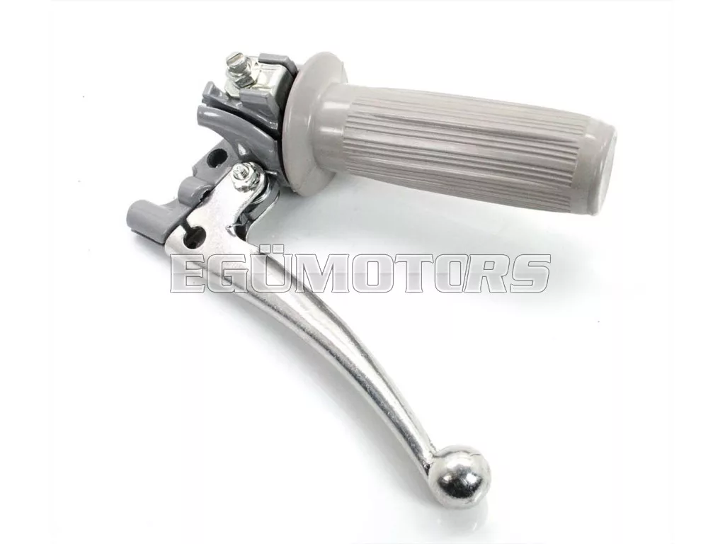 Gázmarkolat szerelvény szürke bordázott gumimarkolattal és alumínium kuplungkarral, golyós végű kivitelben.