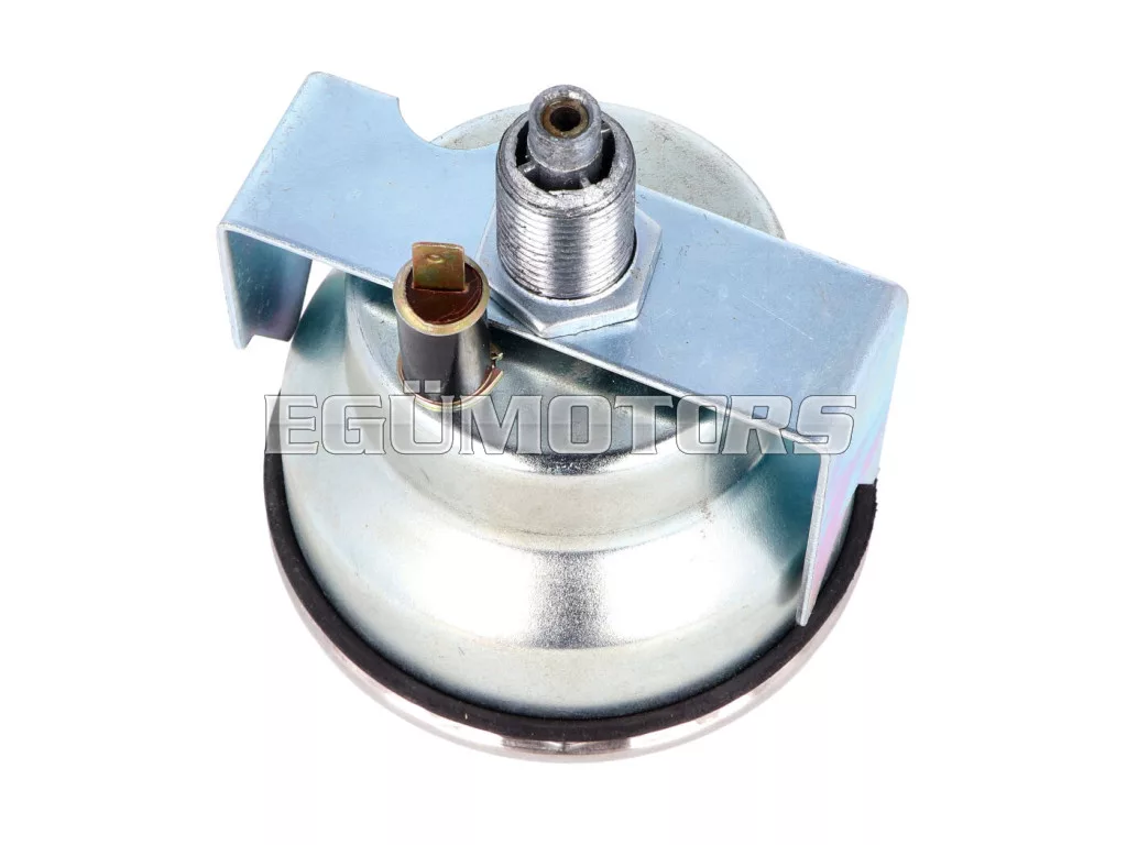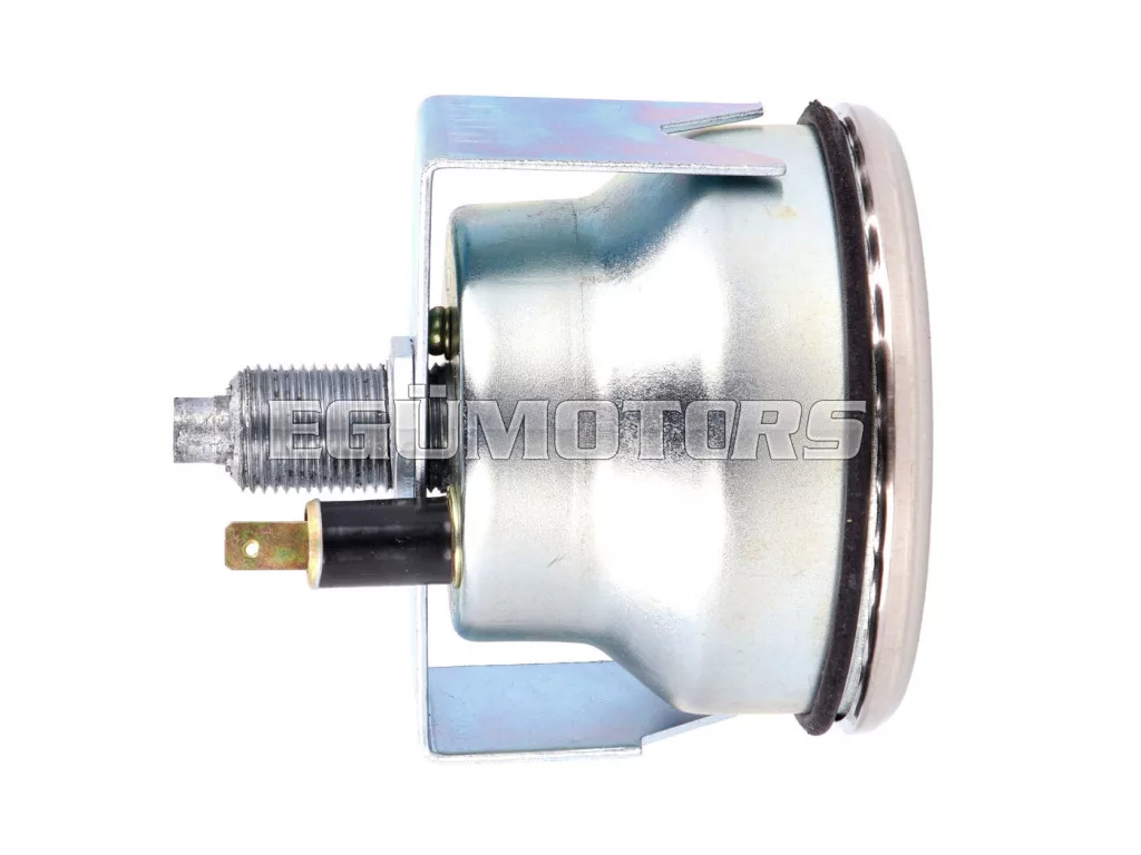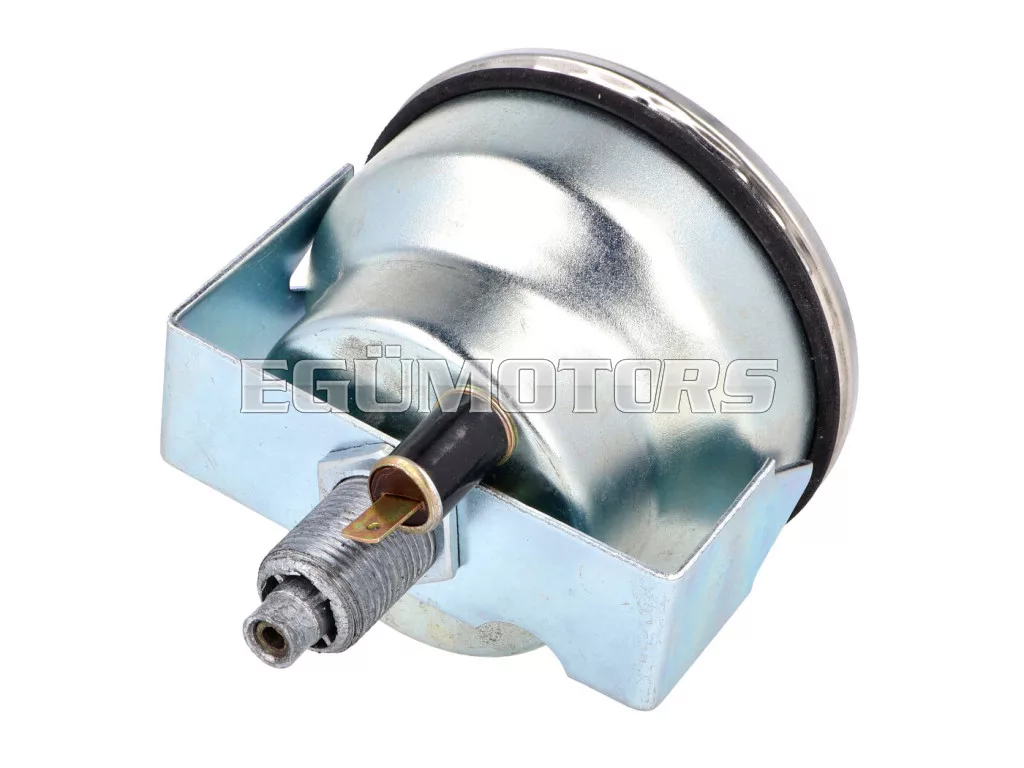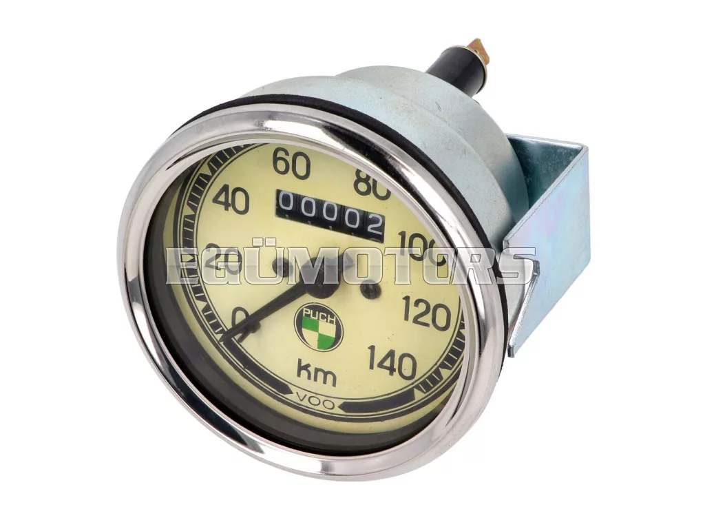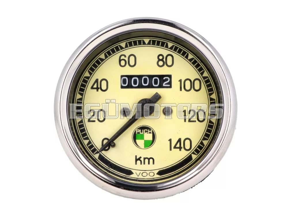 Kerek mechanikus kilométeróra, bézs számlappal, mérési tartomány 140 km/h-ig, kilométer-számlálóval és Puch logóval