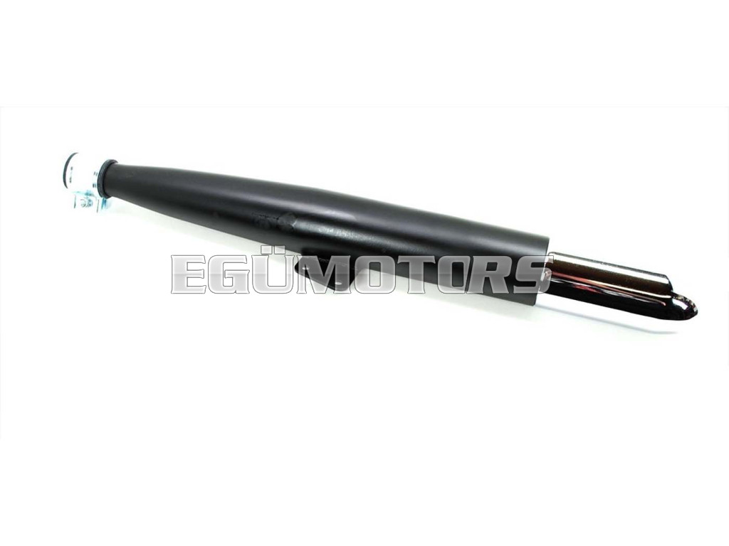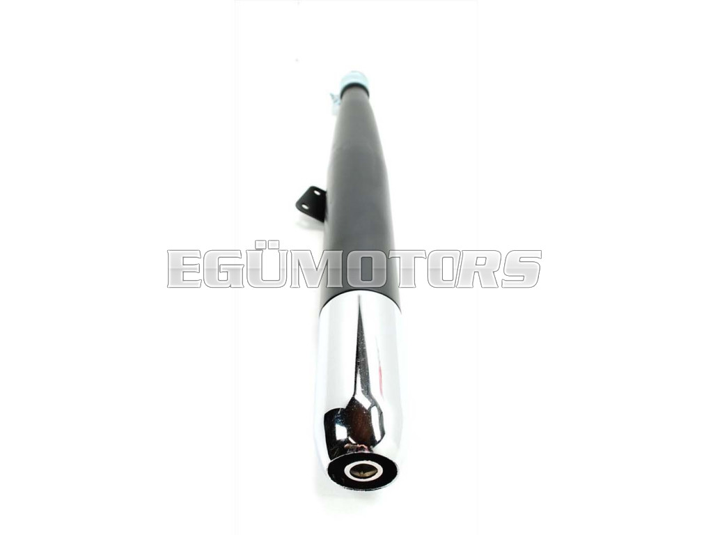 Kipufogó fekete, krómozott végdarabbal, kiváló A-minőségű, 3 részes kivitelben bilincsel és gumialátéttel, rögzítőfüllel ellátva.