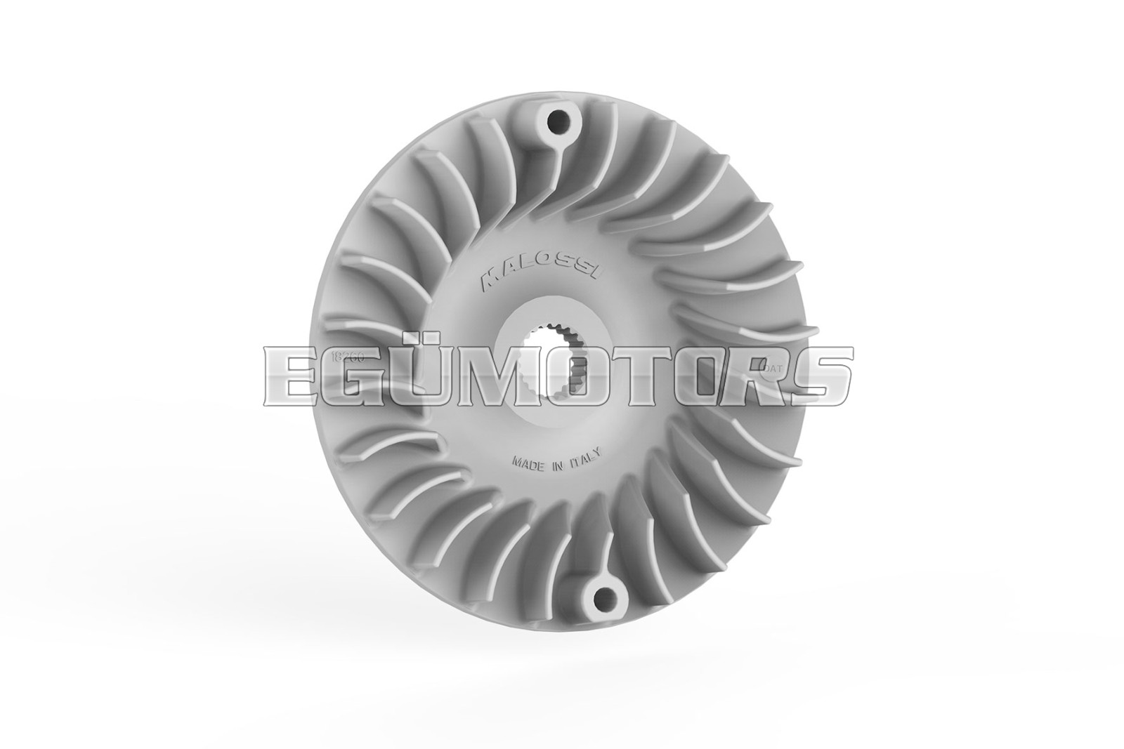 It’s a fixed half-pulley with a diamond finish of the belt-side pulley surface and a redesigned working angle to further increase the gearing range. This component completes the Multivar and renders it unparalleled. Specially designed for the line of variable-speed drives for scooters, it further improves the performance of the drive belt. It is not just a simple accessory, but a very important part for guaranteeing the long life of all the transmission components. The temperatures produced inside the crankcases where variators work with V-belts are prohibitive at critical moments and certain parts, such as transmission belts and variator rollers, sometimes suffer irreparable damage. There are cases in which the rollers could even reach the melting point. Apart from its other advantages, Ventilvar has a greater cooling capacity than the original half-pulley; that’s a result that makes it indispensable for safe and sporty driving.