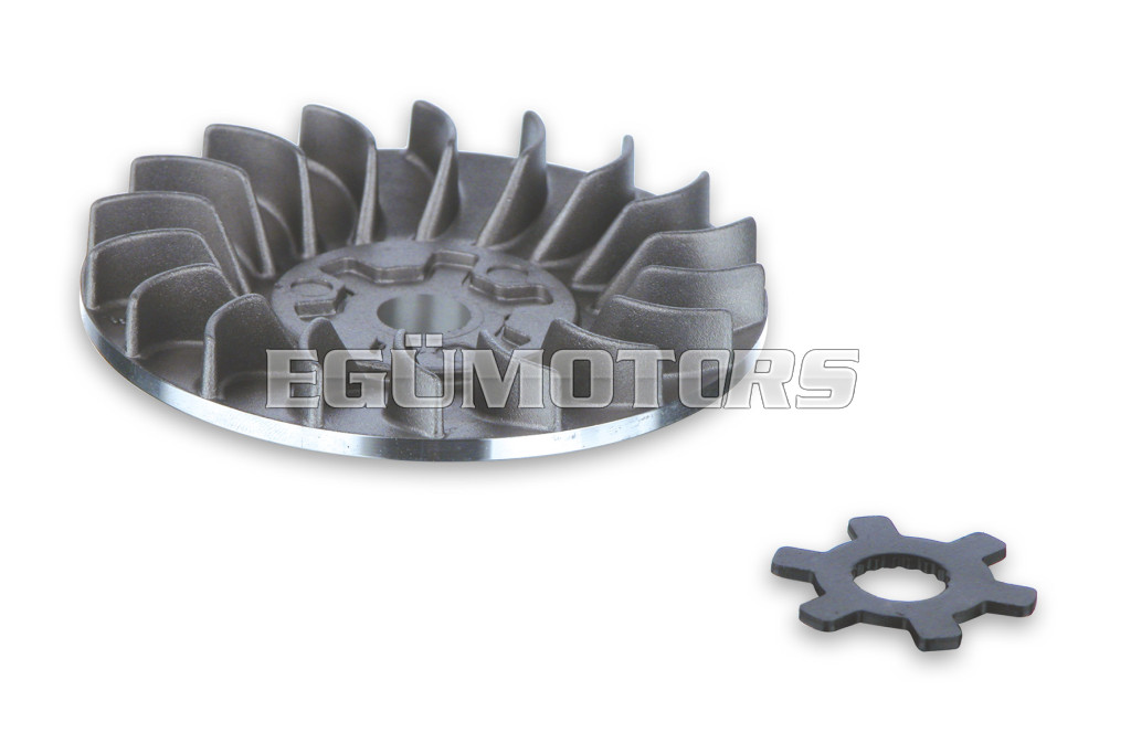 It’s a fixed half-pulley with a diamond finish of the belt-side pulley surface and a redesigned working angle to further increase the gearing range. This component completes the Multivar and renders it unparalleled. Specially designed for the line of variable-speed drives for scooters, it further improves the performance of the drive belt. It is not just a simple accessory, but a very important part for guaranteeing the long life of all the transmission components. The temperatures produced inside the crankcases where variators work with V-belts are prohibitive at critical moments and certain parts, such as transmission belts and variator rollers, sometimes suffer irreparable damage. There are cases in which the rollers could even reach the melting point. Apart from its other advantages, Ventilvar has a greater cooling capacity than the original half-pulley; that’s a result that makes it indispensable for safe and sporty driving.