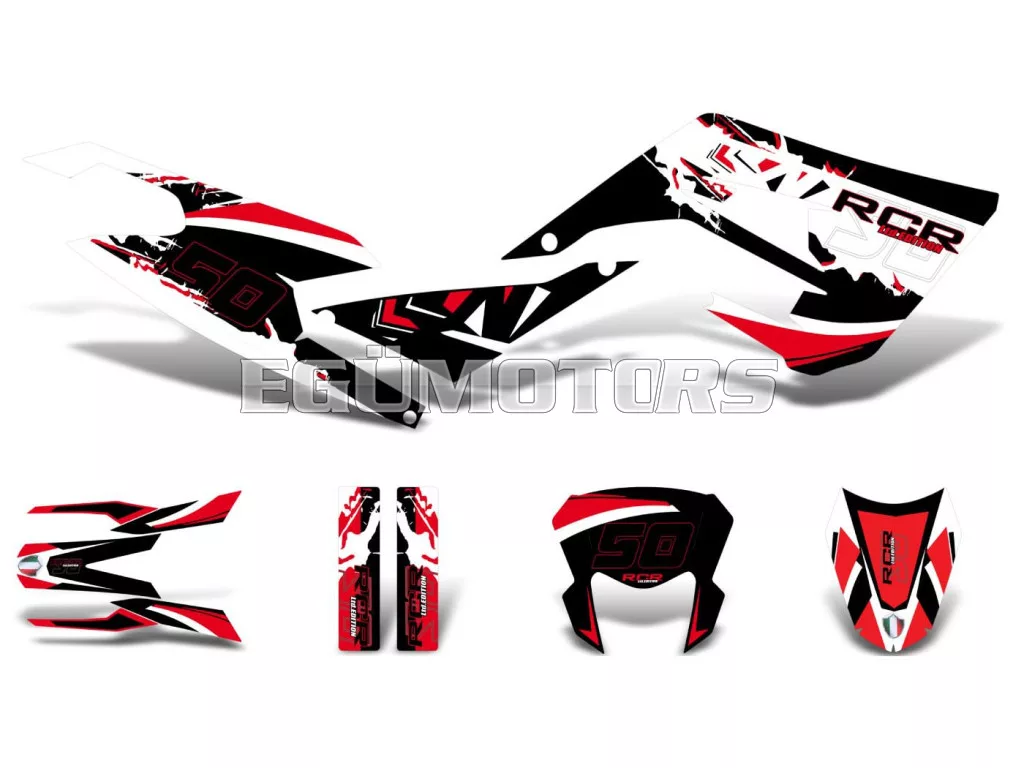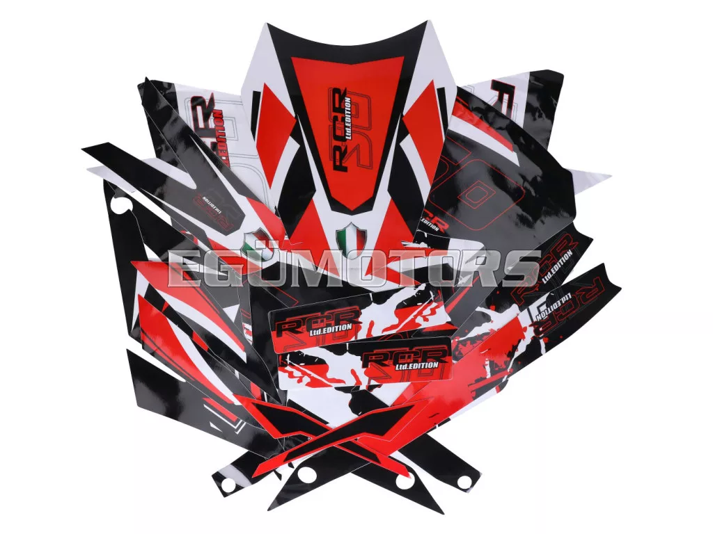 Fényes fekete-fehér-piros matrica készlet, alkalmas 2018-tól gyártott Gilera RCR 50 modellekhez.