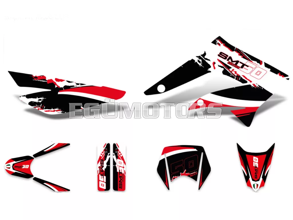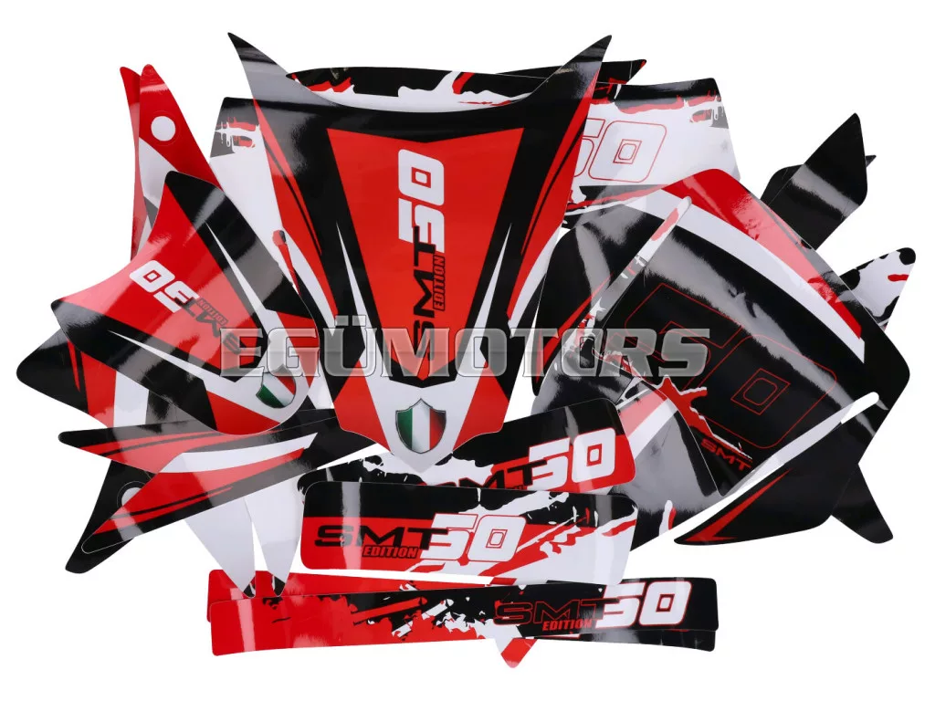 Fényes fekete-fehér-piros matrica készlet, alkalmas Gilera SMT 50 2011-2017 közötti modellekhez.