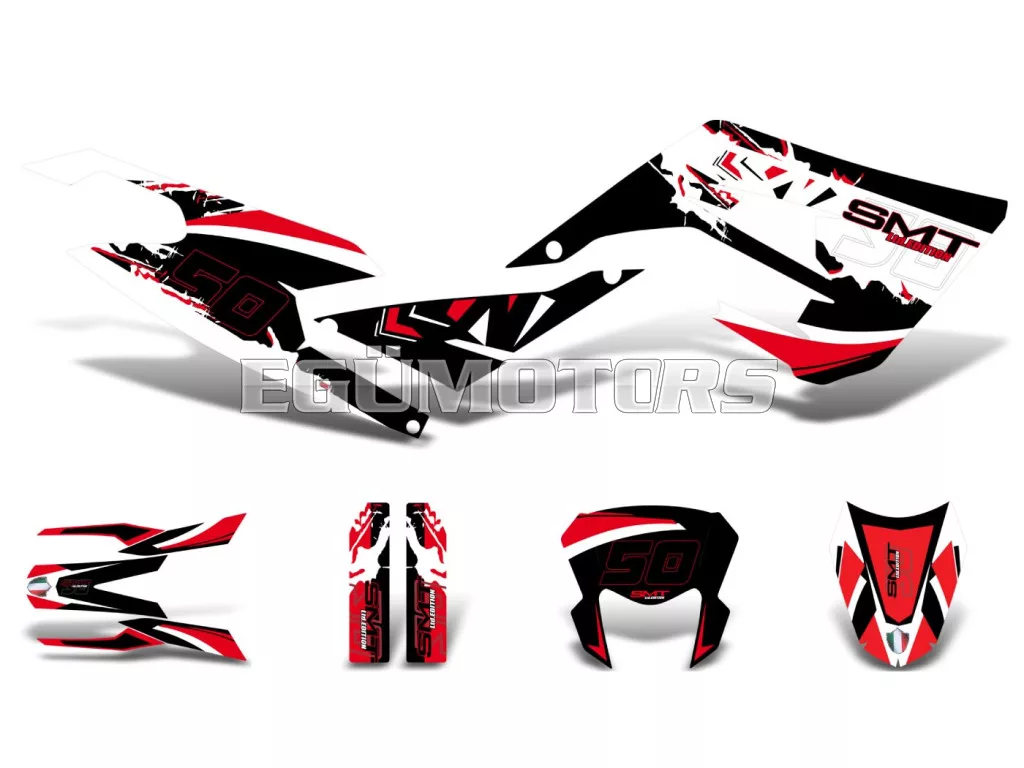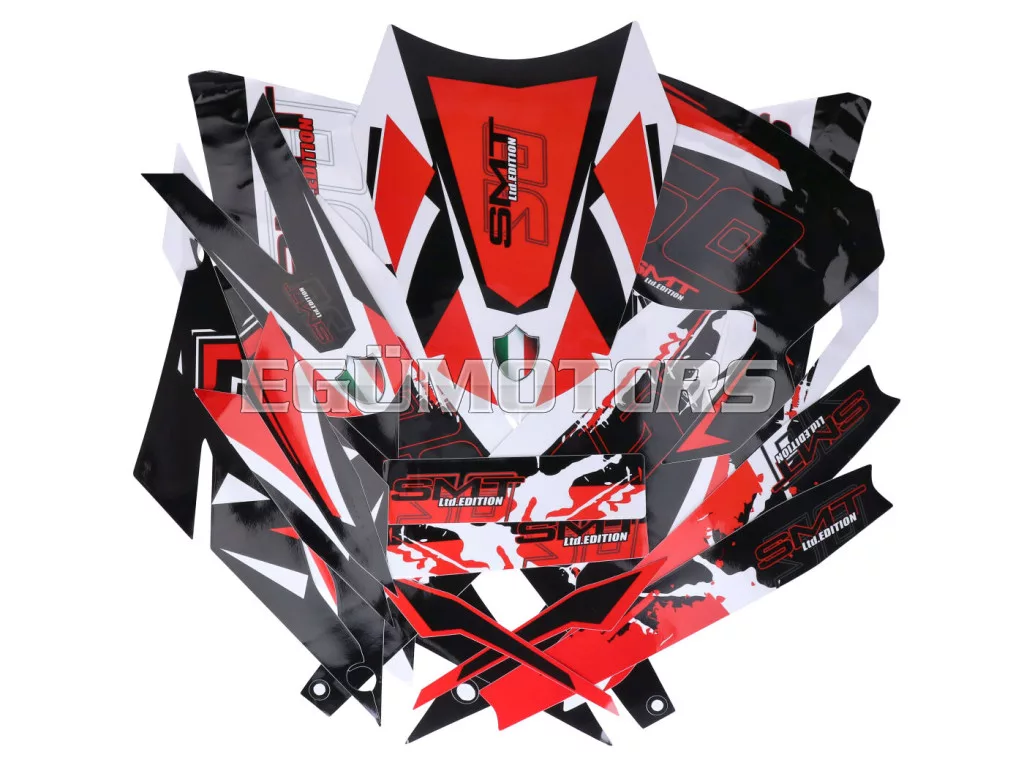 Fényes fekete-fehér-piros matrica készlet, alkalmas 2018-tól gyártott Gilera SMT 50 modellekhez.