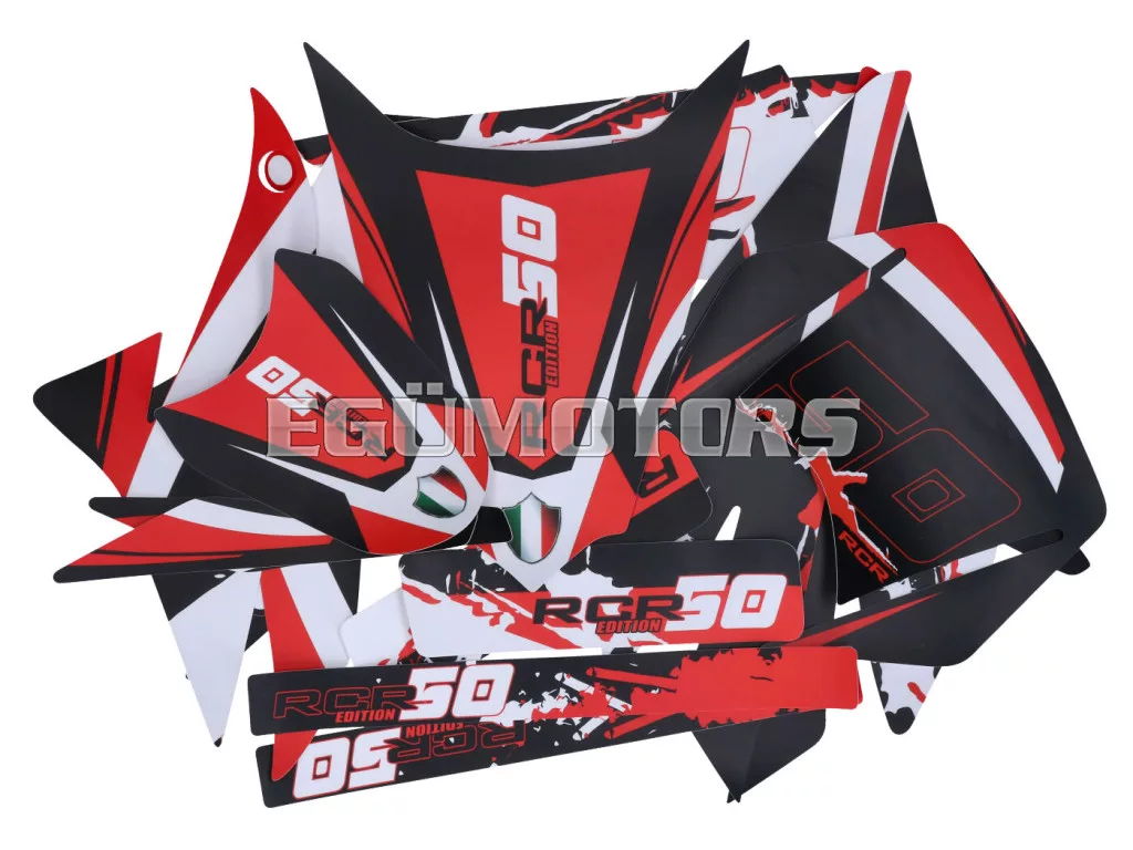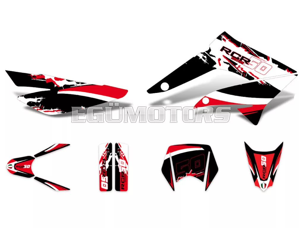 Matt fekete-fehér-piros matrica készlet, alkalmas Gilera RCR 50 2011-2017 közötti modellekhez.