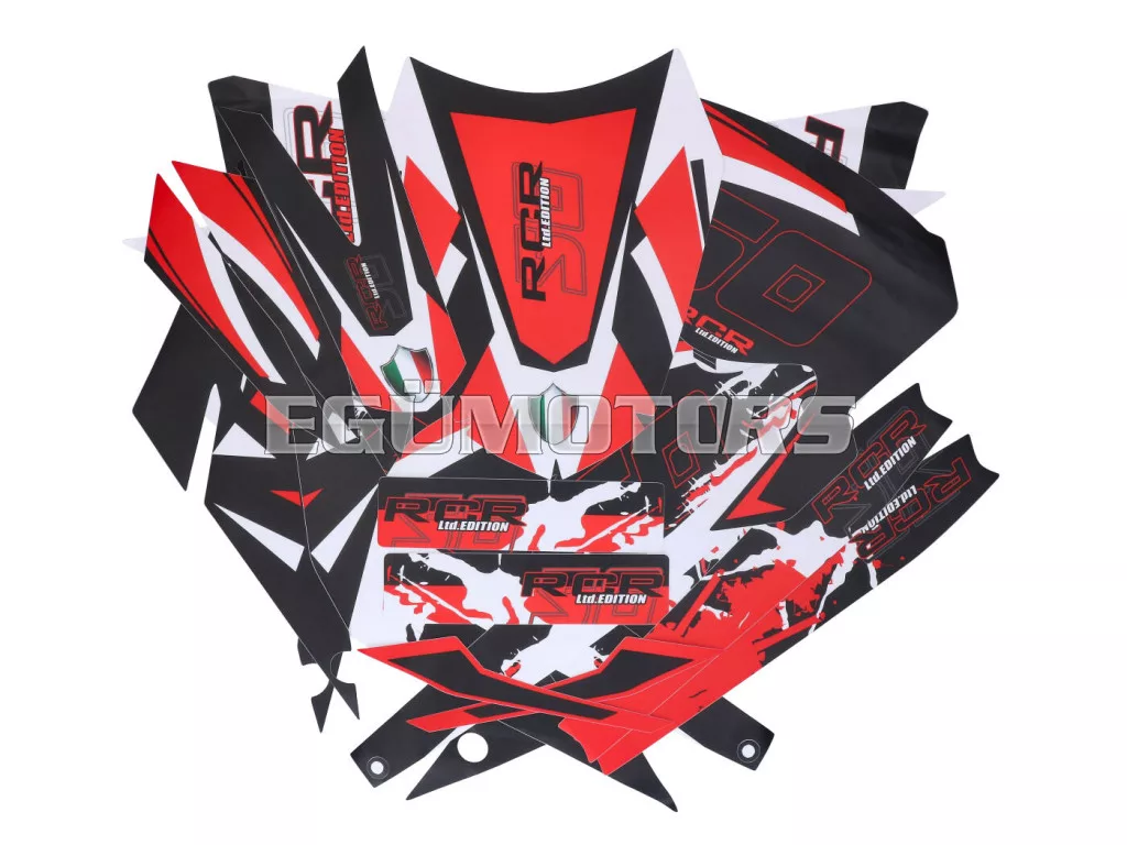 Matt fekete-fehér-piros matrica készlet, alkalmas 2018-tól gyártott Gilera RCR 50 modellekhez.