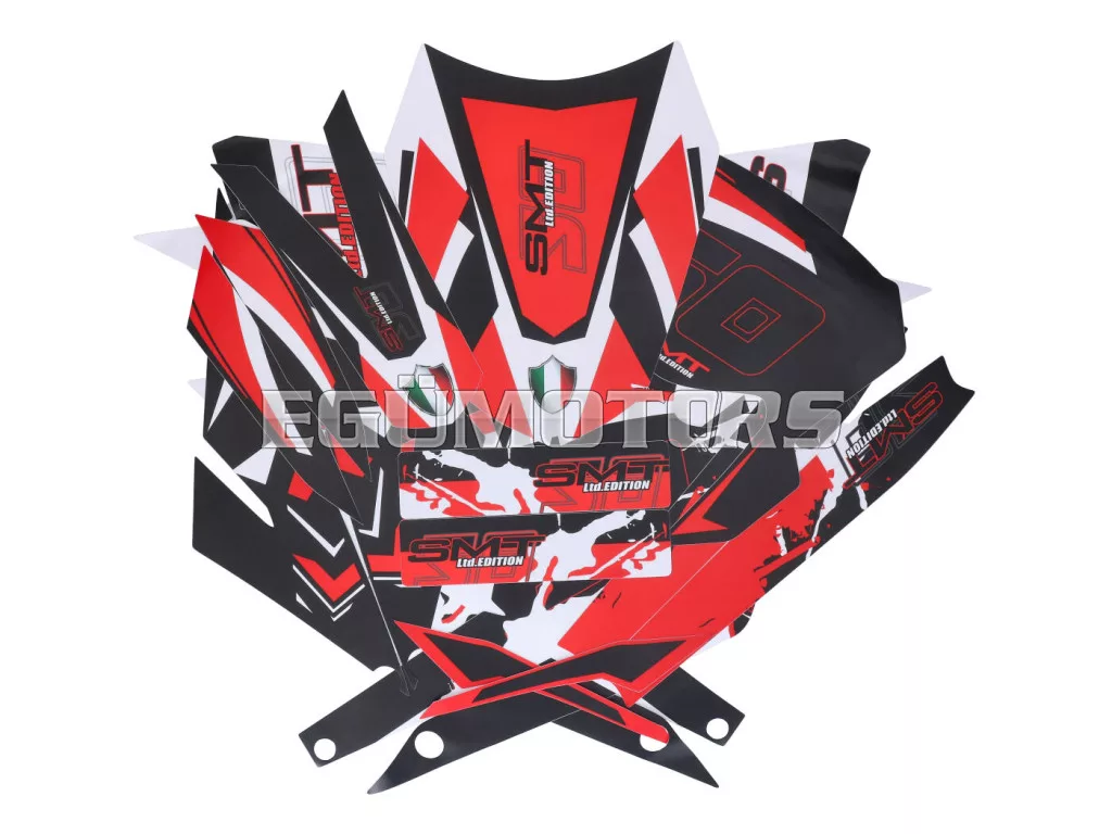 Matt fekete-fehér-piros matrica készlet, alkalmas 2018-tól gyártott Gilera SMT 50 modellekhez.