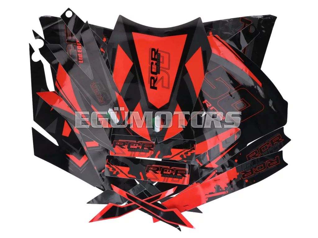 Fényes fekete-piros-szürke matrica készlet, alkalmas 2018-tól gyártott Gilera RCR 50 modellekhez.