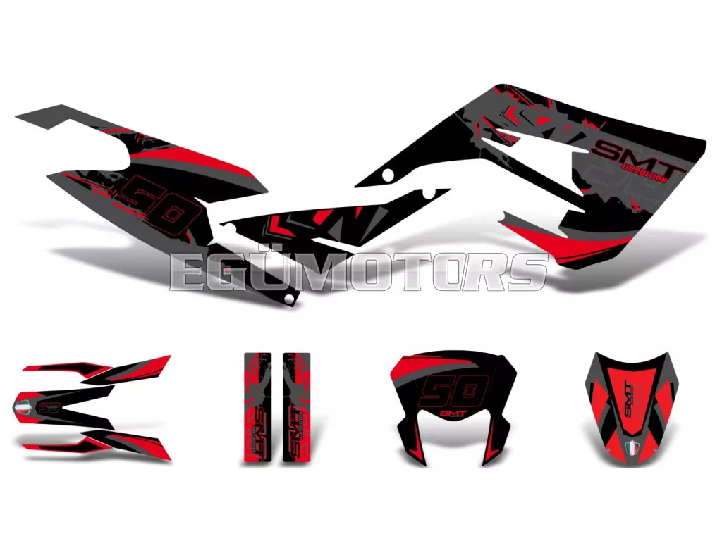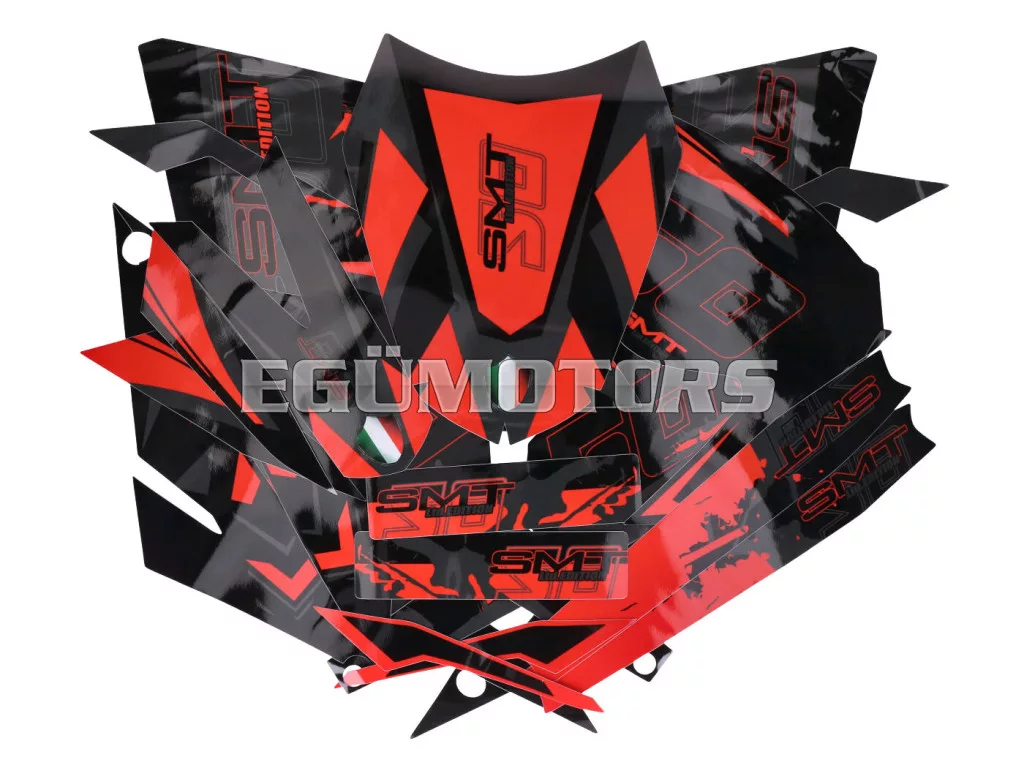 Fényes fekete-piros-szürke matrica készlet, alkalmas 2018-tól gyártott Gilera SMT 50 modellekhez. Az alábbi típusokhoz használható az alkatrész: Gilera-SMT 50 18- E4 (D50B) ZDPKKB00 Gilera-SMT 50 Drifting 19- E4 (D50B) [ZAPKKB07]