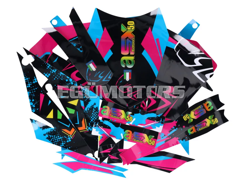 Fényes fekete-rózsaszín-kék matrica készlet, alkalmas Aprilia SX50, Euro4 emissziós szabványú, 2018-tól gyártott modellekhez.