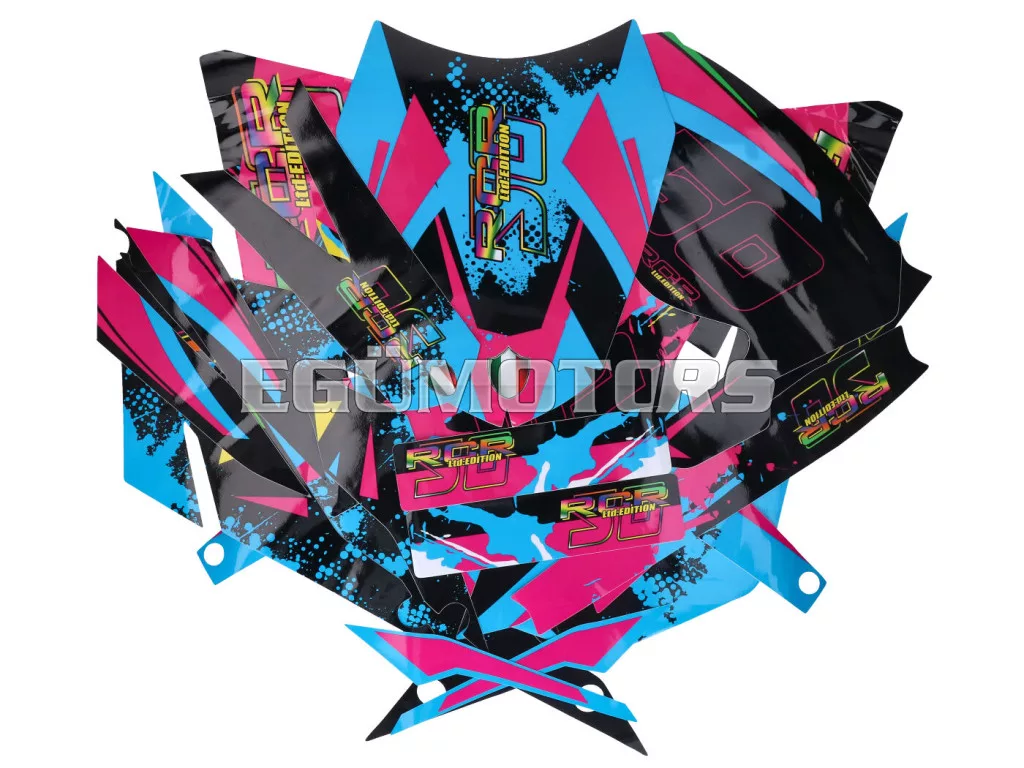 Fényes fekete-rózsaszín-kék matrica készlet, alkalmas 2018-tól gyártott Gilera RCR 50 modellekhez.