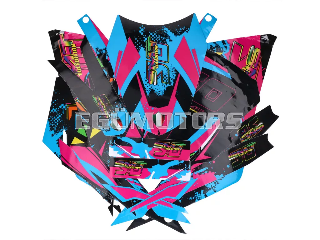 Fényes fekete-rózsaszín-kék matrica készlet, alkalmas 2018-tól gyártott Gilera SMT 50 modellekhez.