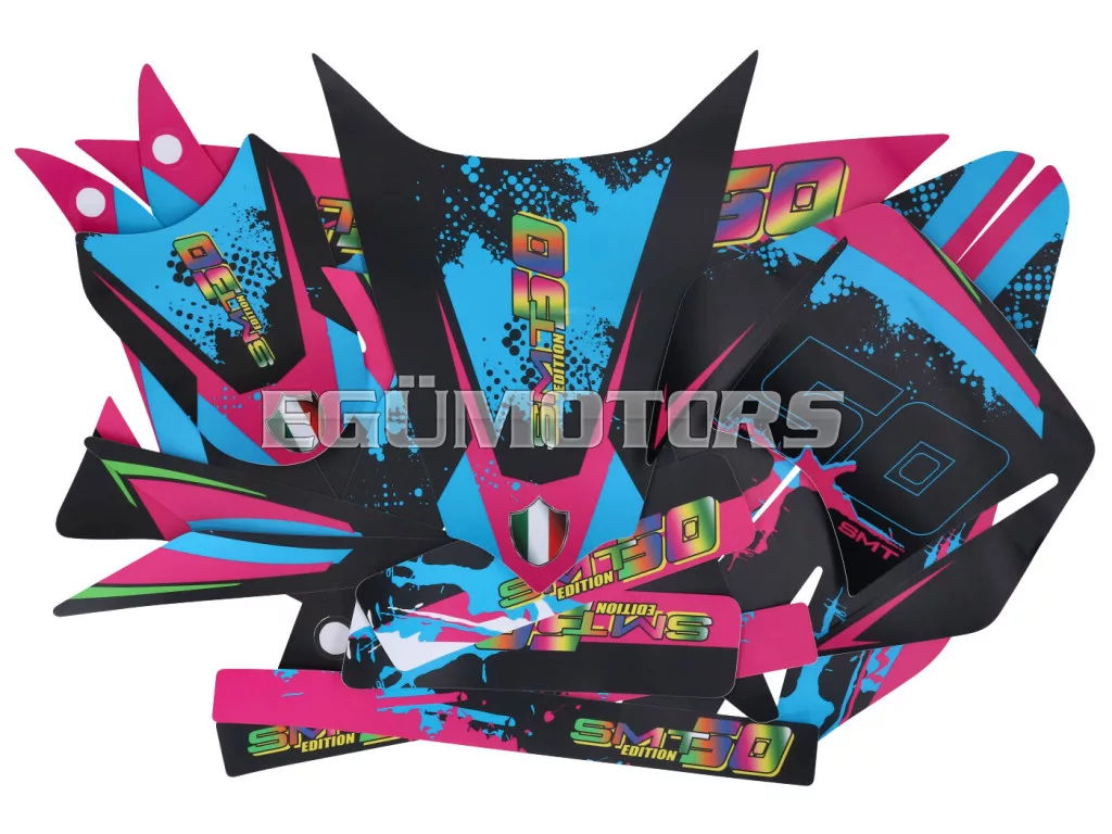 Matt fekete-rózsaszín-kék matrica készlet, alkalmas Gilera SMT 50 2011-2017 közötti modellekhez.