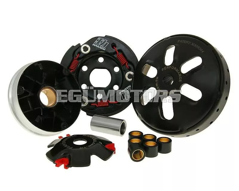 A Naraku hajtáslánc készlet Eco verziója tartalma: kuplung, kuplungdob és variátor.