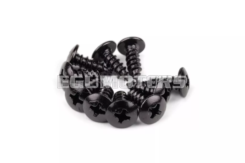 Kiváló minőségű, fekete színű alumínium önmetsző csavarok idomok rögzítéséhez. Ideális megoldás a burkolatelemek biztonságos felfogatására, miközben egy kis optikai tuningot is ad a motor vagy robogó megjelenéséhez.
