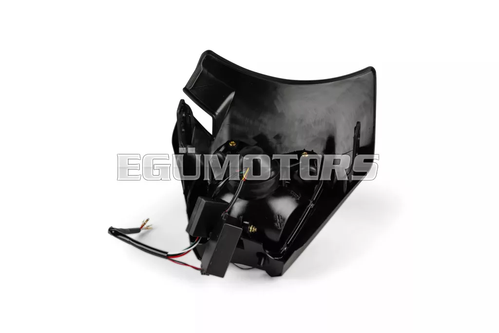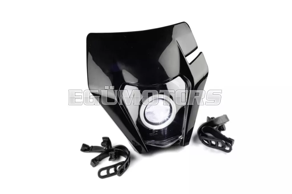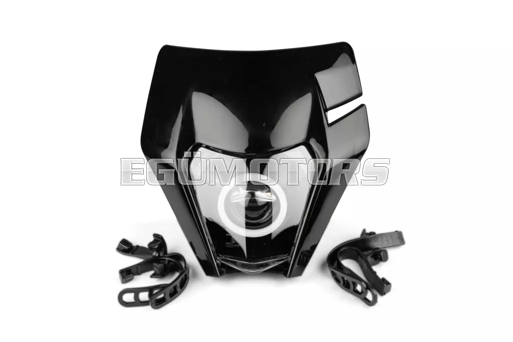 Fényszóró burkolat KTM EXC 2020-2023, fekete, RGB gyűrűvel és közúti engedéllyel, 50cc-es supermoto, motocross, enduro motorokra vagy egyéb kétkerekű járművekre.