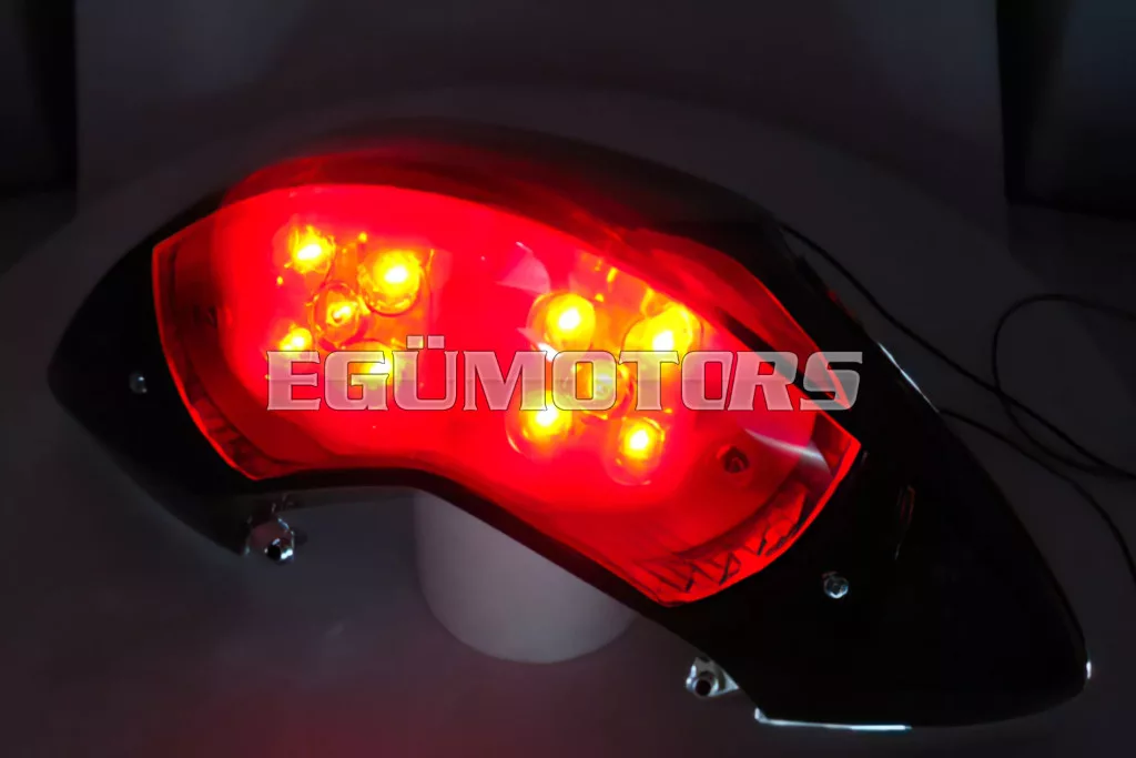 A STR8 Black Line hátsó lámpa egy kiváló minőségű hátsó világítás sötétített búrával. A fekete füstszínű lencsék mellett a Black Line lámpák háttere is fekete, nem pedig a megszokott krómozott kivitelű. A megbízható LED technológiával kombinálva a Black Line termékek modern és kifejezetten menő megjelenést kölcsönöznek a robogódnak.
