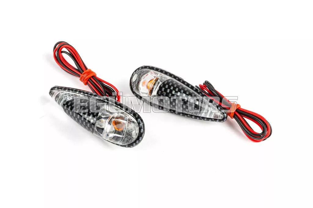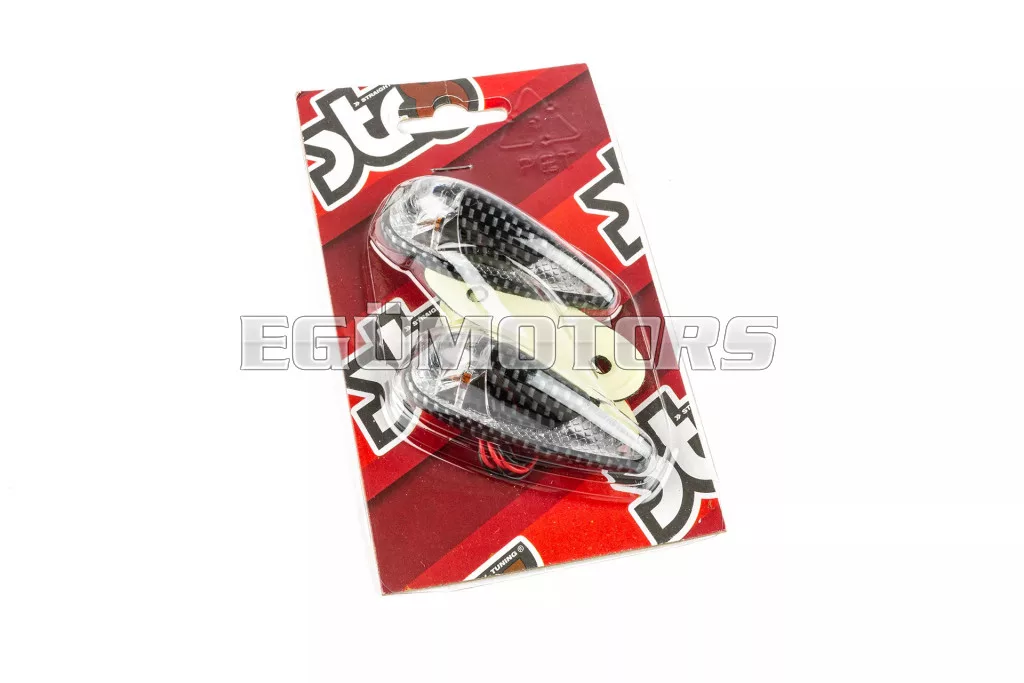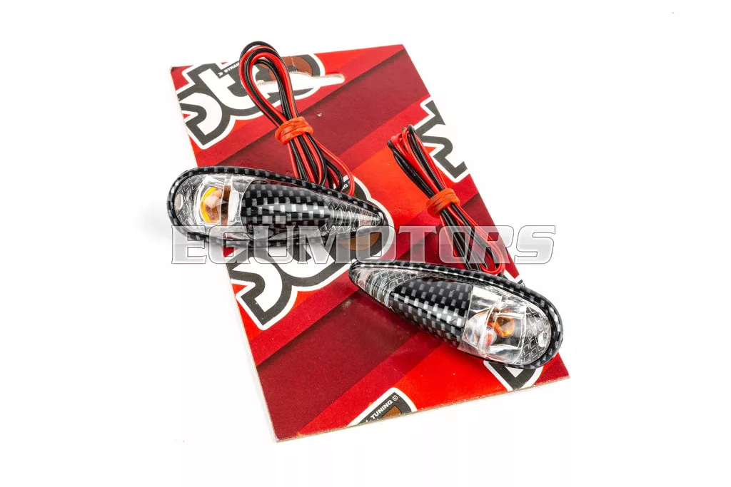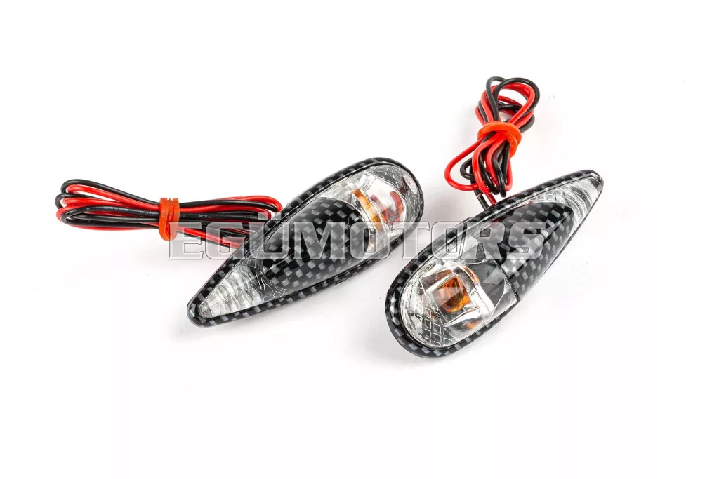 Szép, csepp alakú irányjelző / lámpa „Fender”, karbon / fehér / narancs kivitelben.