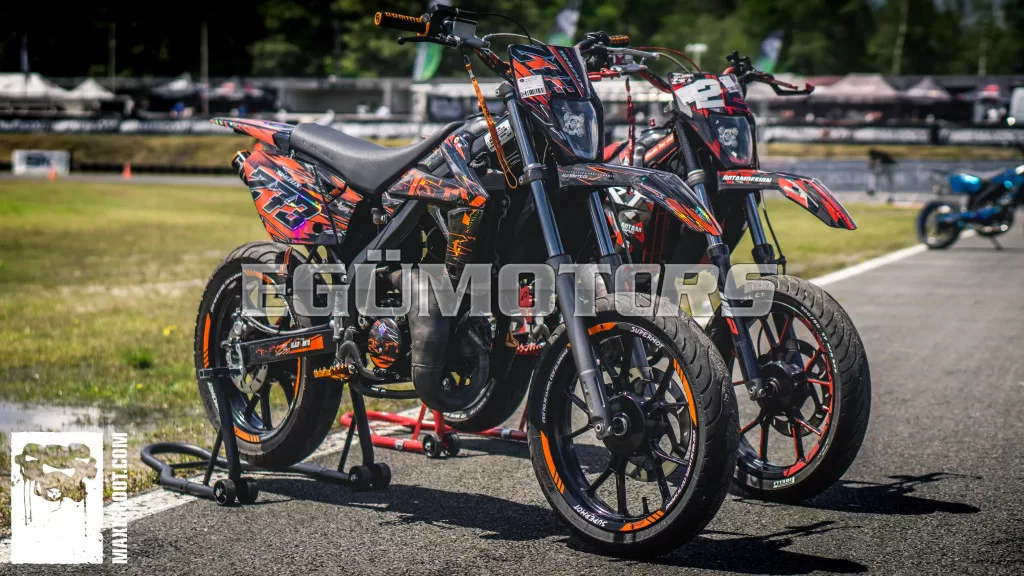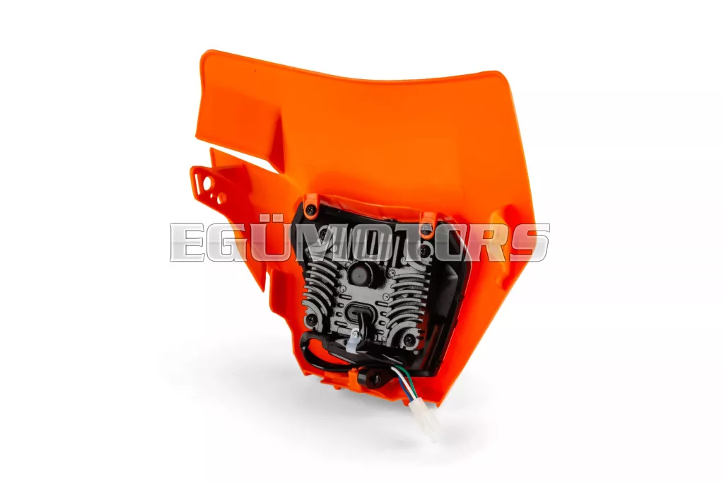 LED első fényszóró KTM EXC típus, narancssárga, 2020 utáni modellekhez, felszerelhető 50cc-es motorokra, supermoto és enduro motorokra, illetve egyéb kétkerekű járművekre.