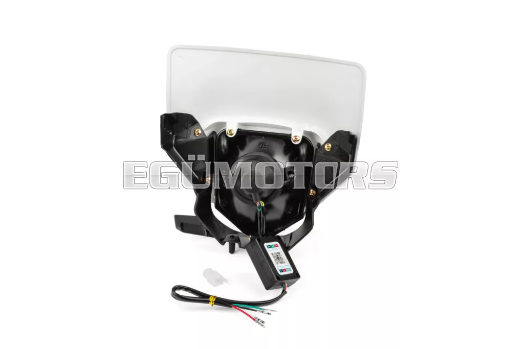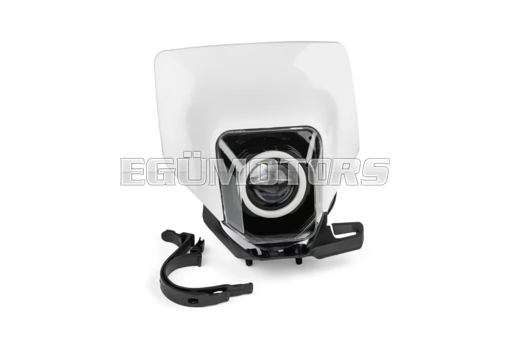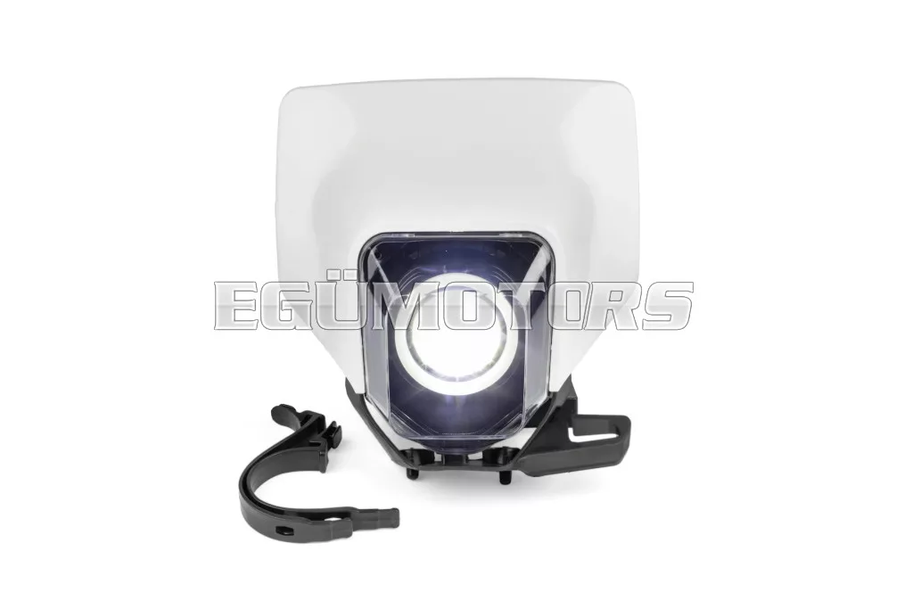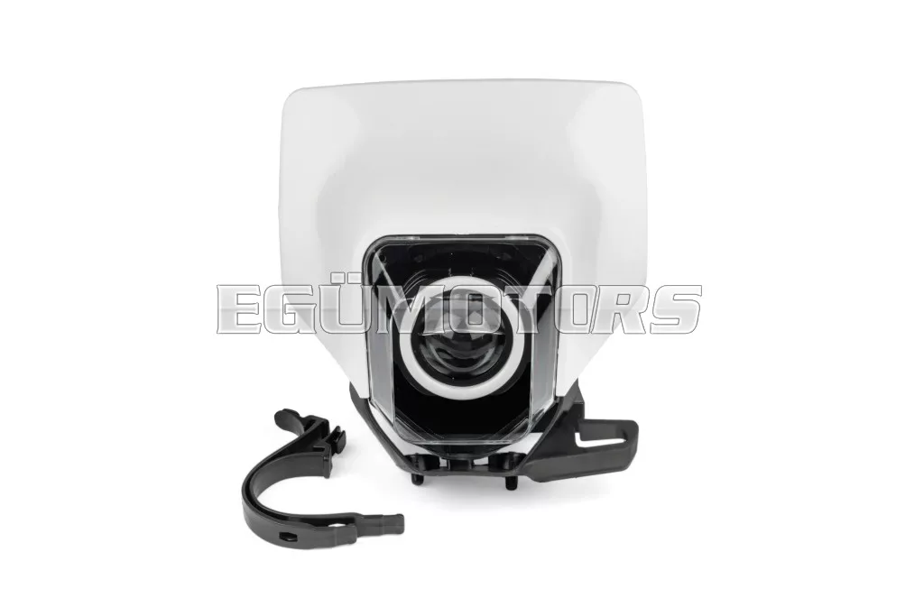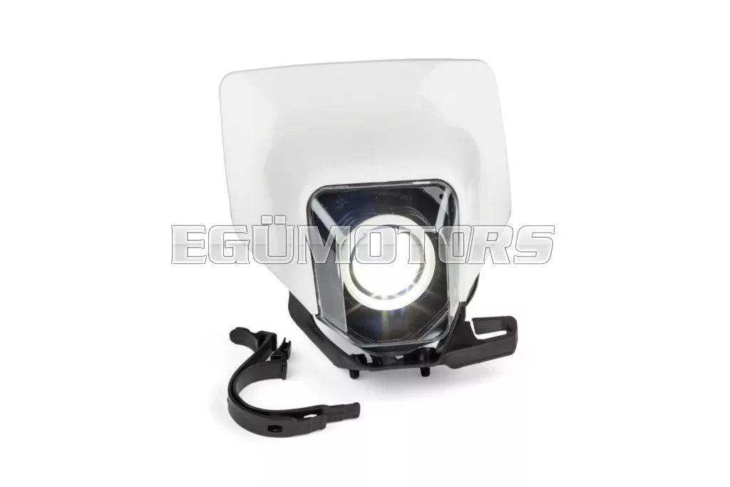 Husqvarna FE / TE típusú LED fényszóró burkolat RGB gyűrűvel, felszerelhető 50cc-es sebességváltós mopedre, cross motorra, supermoto-ra, enduro-ra vagy egyéb kétkerekű járművekre.
