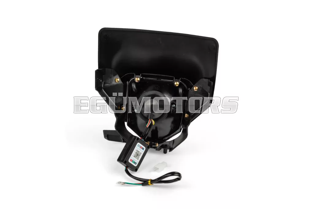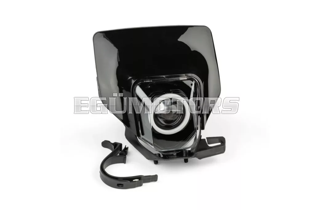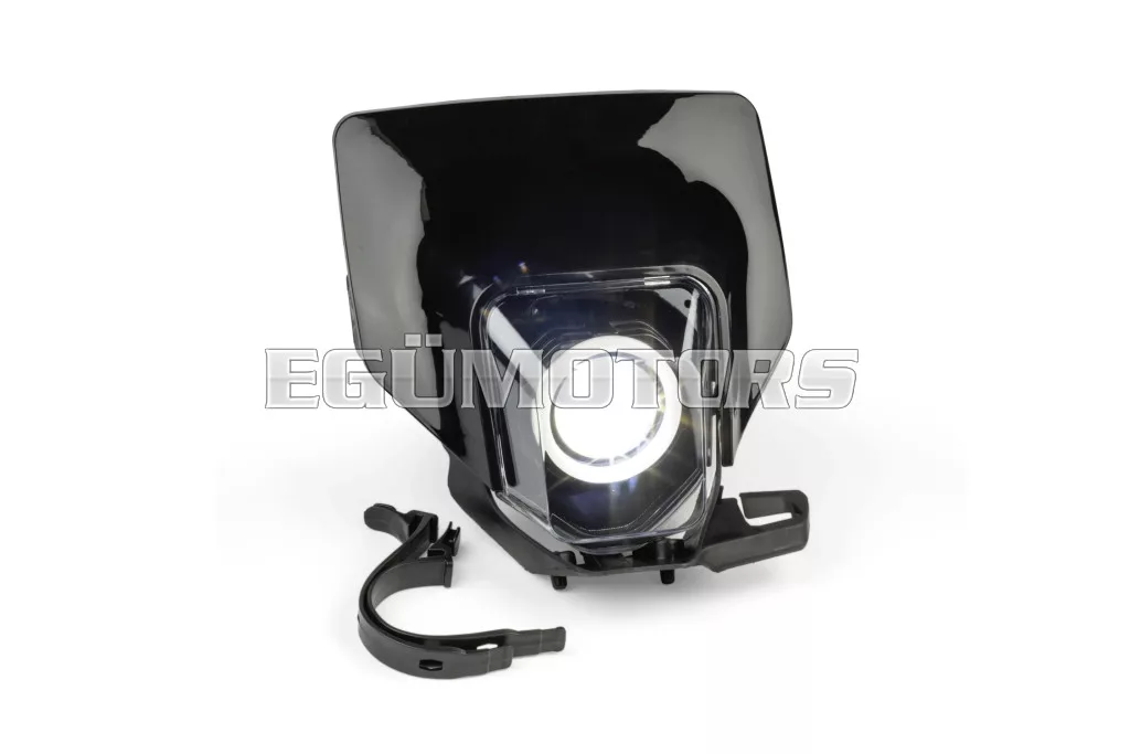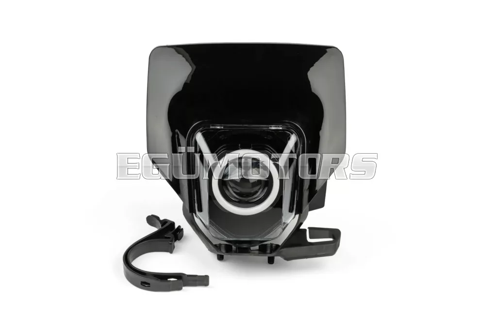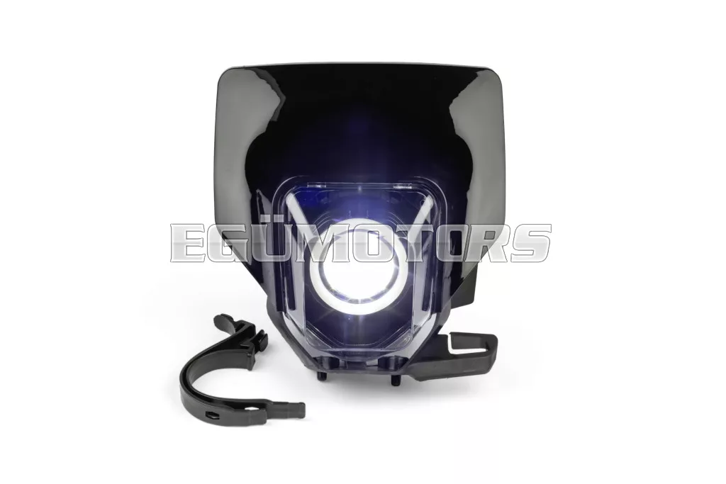 Husqvarna FE / TE típusú LED fényszóró burkolat RGB gyűrűvel, felszerelhető 50cc-es sebességváltós mopedre, cross motorra, supermoto-ra, enduro-ra vagy egyéb kétkerekű járművekre.