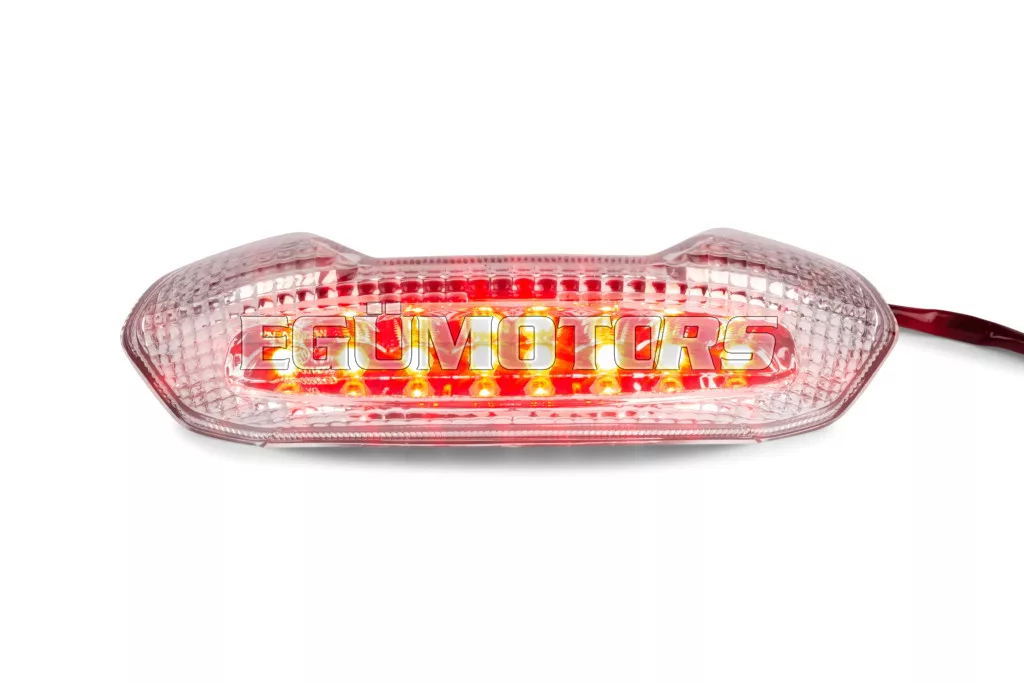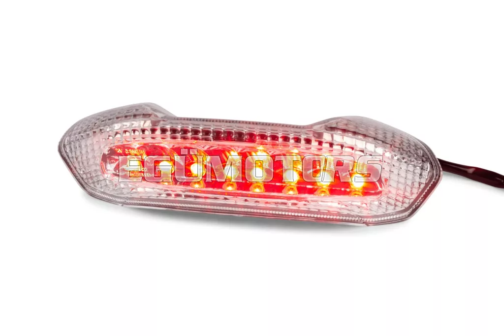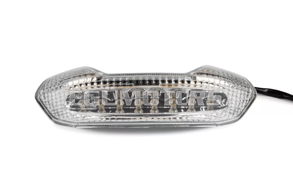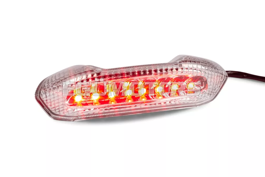 STR8 LED-es hátsó lámpa irányjelző funkció nélkül, átlátszó búrával, alkalmas Piaggio NRG Power DD / DT modellekhez.