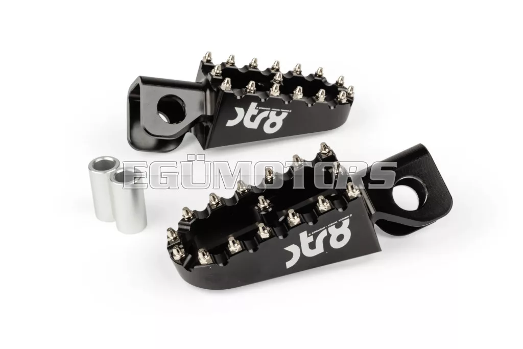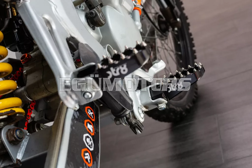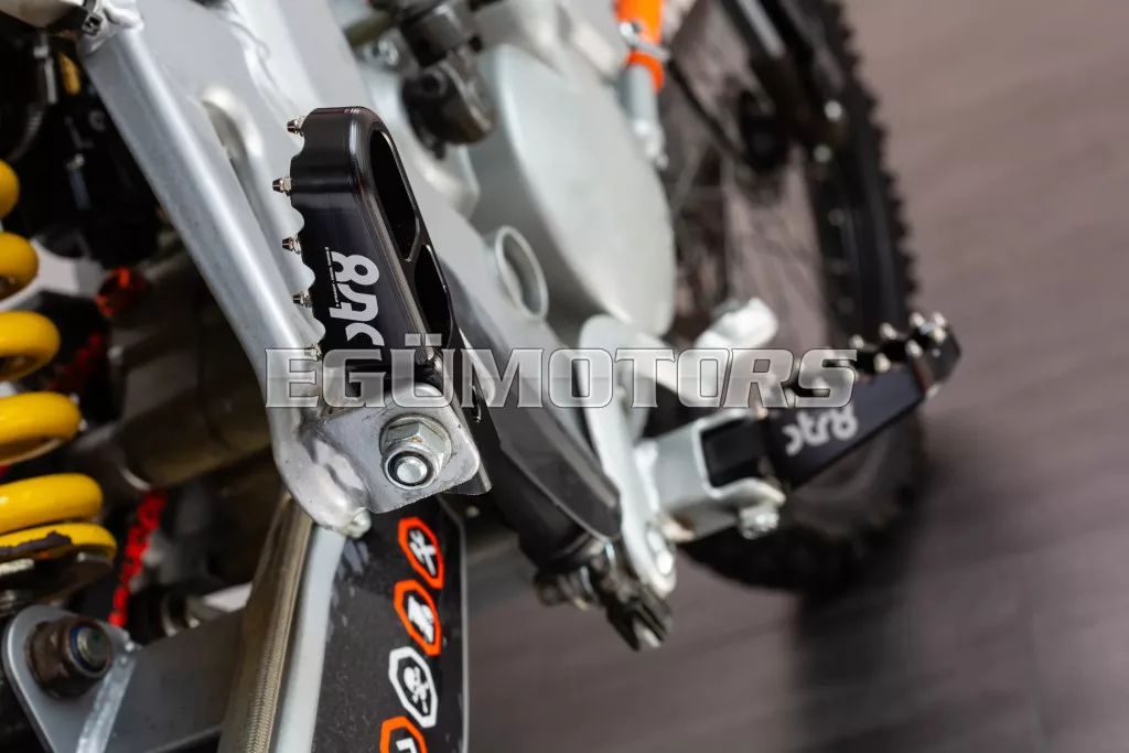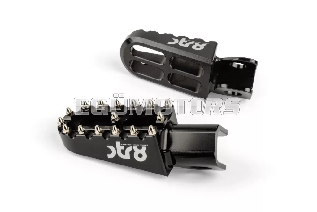 Adj stílust és jobb tapadást 50cc-es motorodnak: az STR8 lábtartók CNC-megmunkált, eloxált alumíniumból készülnek. Látványos megjelenést és stabil alátámasztást biztosítanak. Lézergravírozott STR8 logóval és agresszív, motocross stílusú fogazással a még jobb tapadás érdekében.