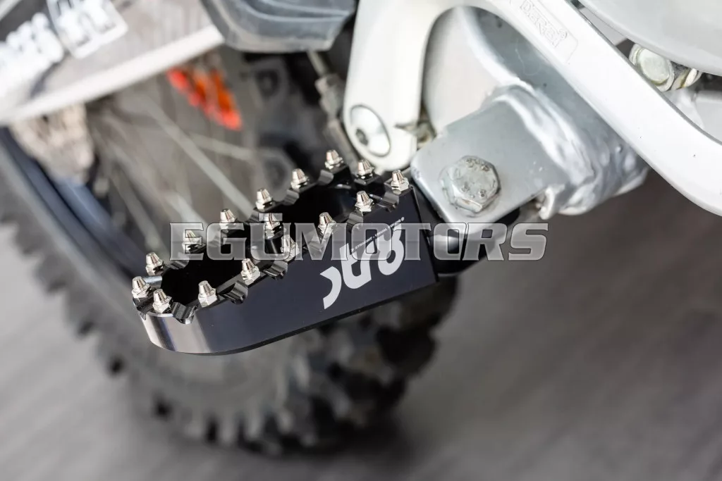 Az éles, motocross stílusú fogak kiváló tapadást biztosítanak, és érezhetően jobb tartást adnak a gyári lábtartókhoz képest, ideális sportos motorozáshoz.