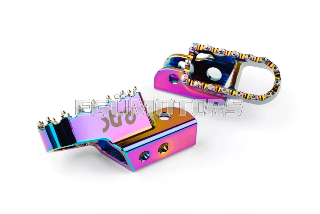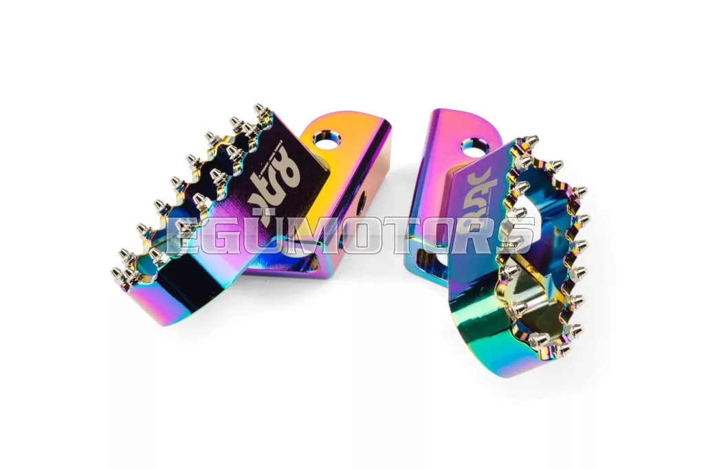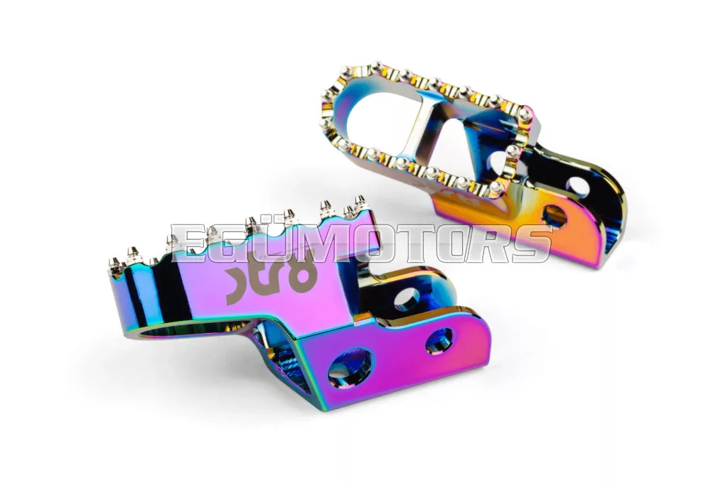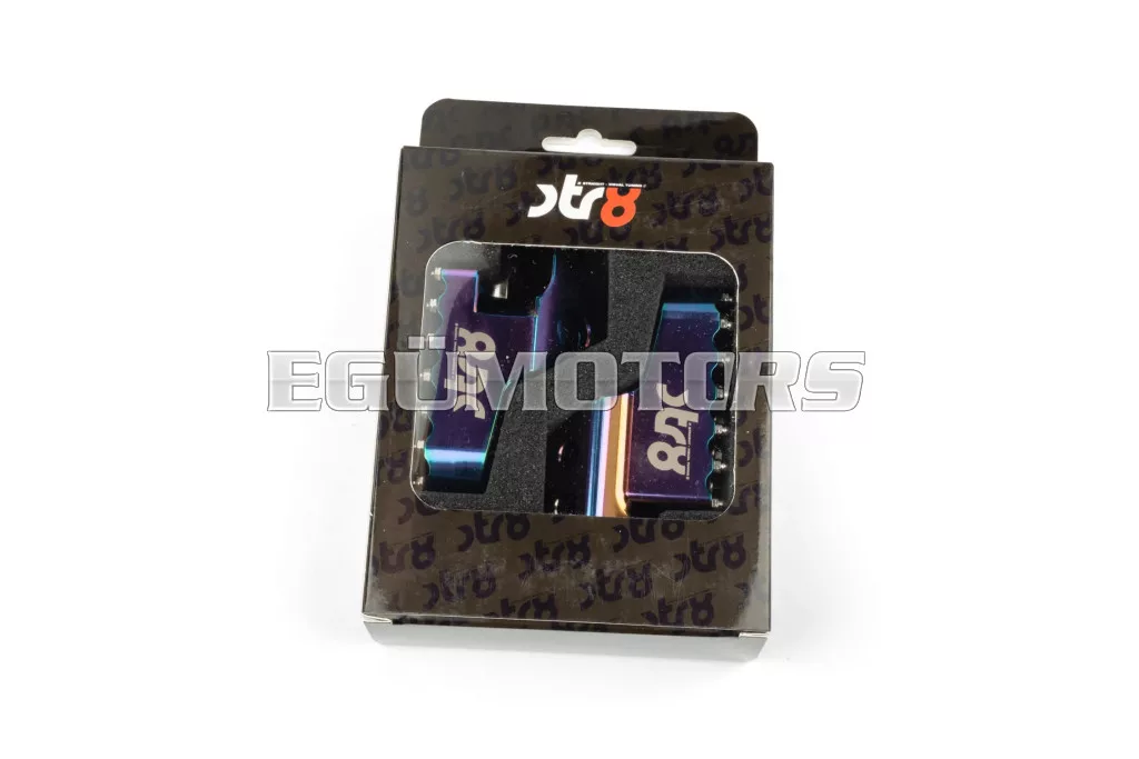 Adj stílust és jobb tapadást 50cc-es motorodnak: az STR8 vezetői lábtartók CNC-megmunkált, eloxált alumíniumból készülnek. Látványos megjelenést és stabil alátámasztást biztosítanak. Lézergravírozott STR8 logóval és agresszív, motocross stílusú fogazással a még jobb tapadás érdekében.