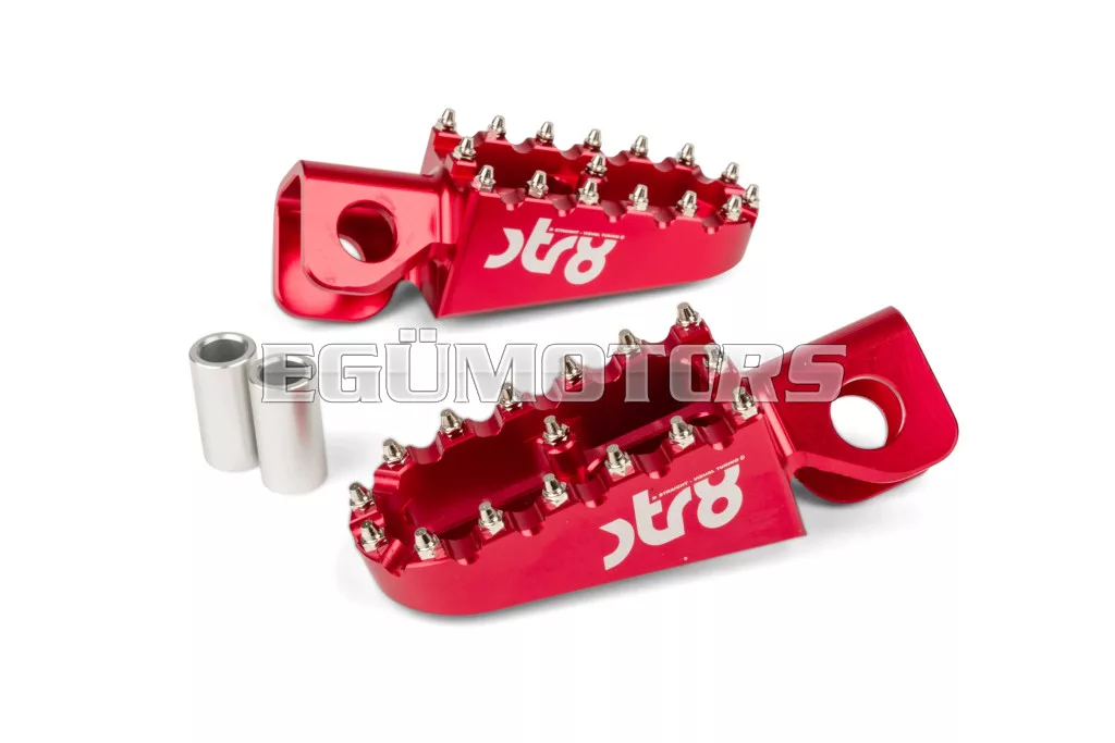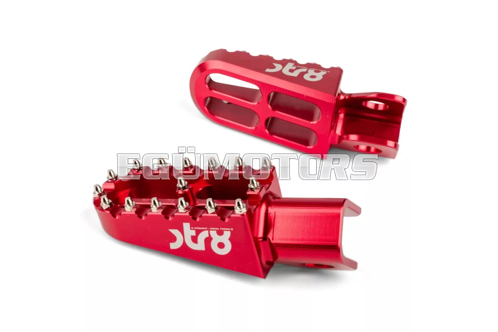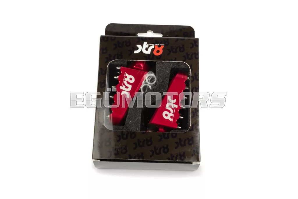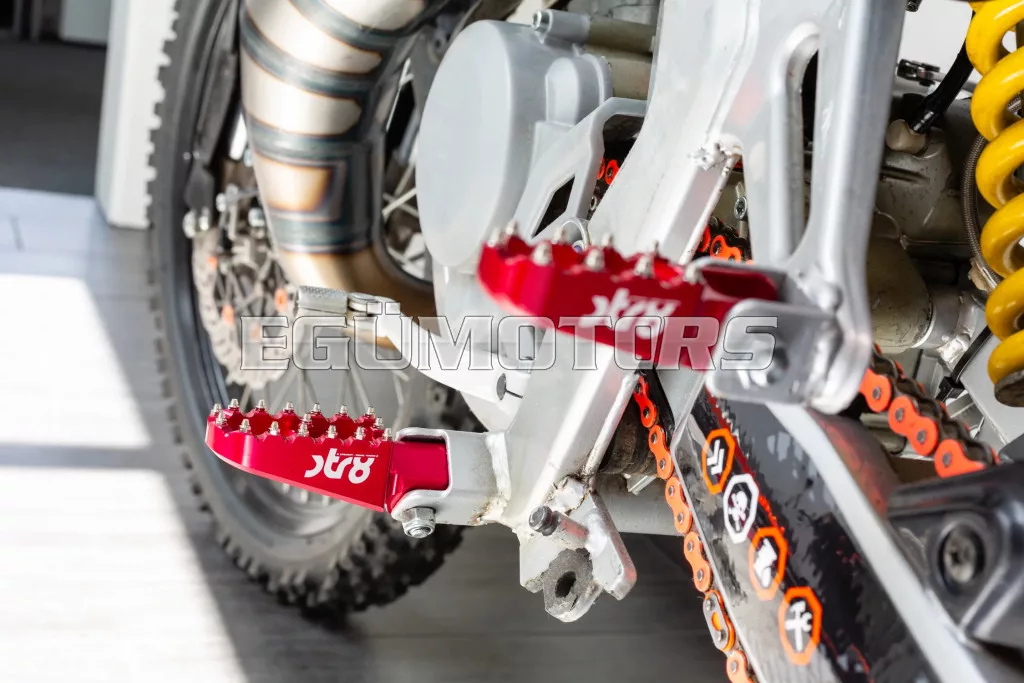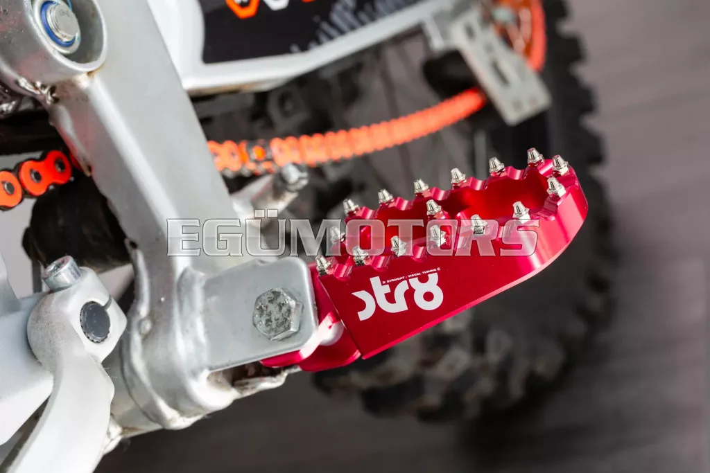 Adj stílust és jobb tapadást 50cc-es motorodnak: az STR8 lábtartók CNC-megmunkált, eloxált alumíniumból készülnek. Látványos megjelenést és stabil alátámasztást biztosítanak. Lézergravírozott STR8 logóval és agresszív, motocross stílusú fogazással a még jobb tapadás érdekében.