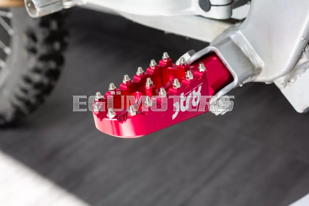 Az éles, motocross stílusú fogak kiváló tapadást biztosítanak, és érezhetően jobb tartást adnak a gyári lábtartókhoz képest, ideális sportos motorozáshoz.