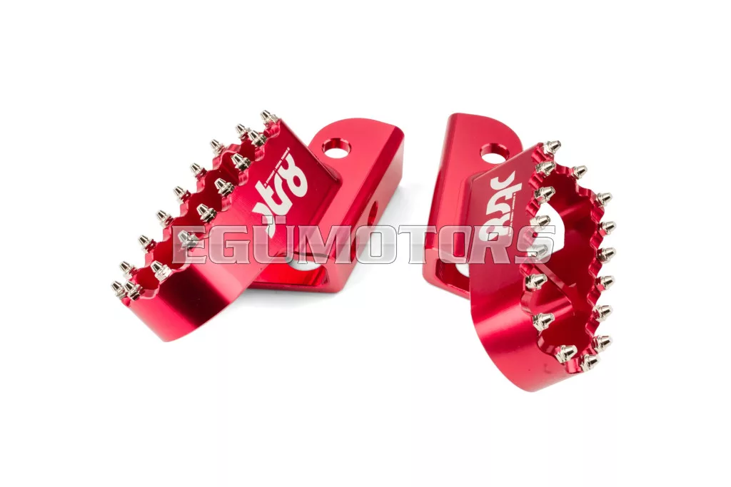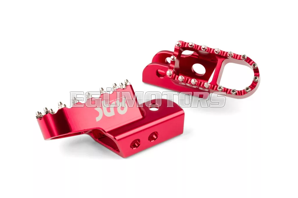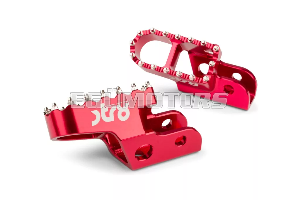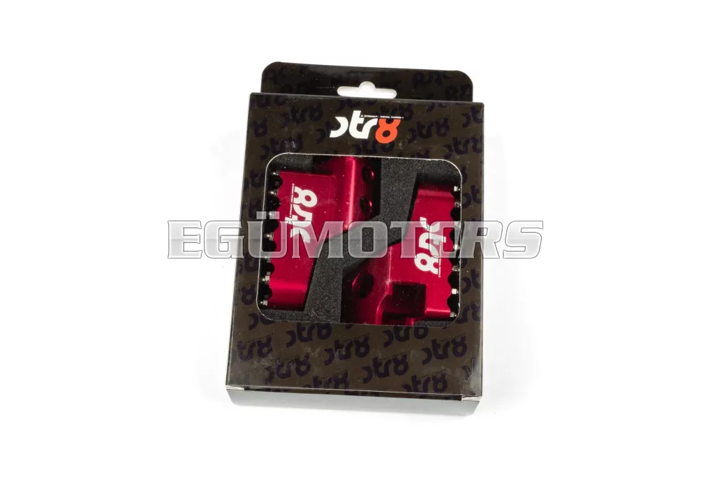 Adj stílust és jobb tapadást 50cc-es motorodnak: az STR8 vezetői lábtartók CNC-megmunkált, eloxált alumíniumból készülnek. Látványos megjelenést és stabil alátámasztást biztosítanak. Lézergravírozott STR8 logóval és agresszív, motocross stílusú fogazással a még jobb tapadás érdekében.