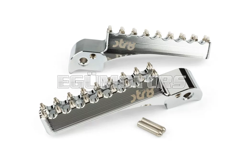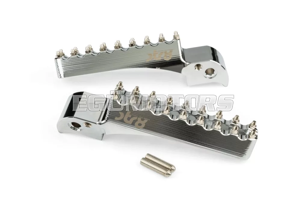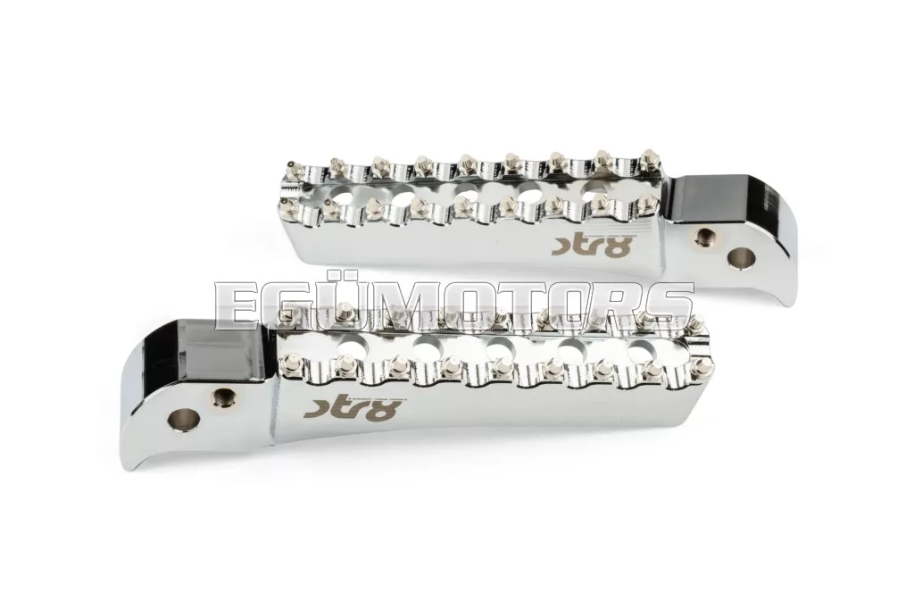 Adj stílust és jobb tapadást 50cc-es motorodnak: az STR8 utas lábtartók CNC-megmunkált, eloxált alumíniumból készülnek. Látványos megjelenést és stabil alátámasztást biztosítanak. Lézergravírozott STR8 logóval és agresszív, motocross stílusú fogazással a még jobb tapadás érdekében.
