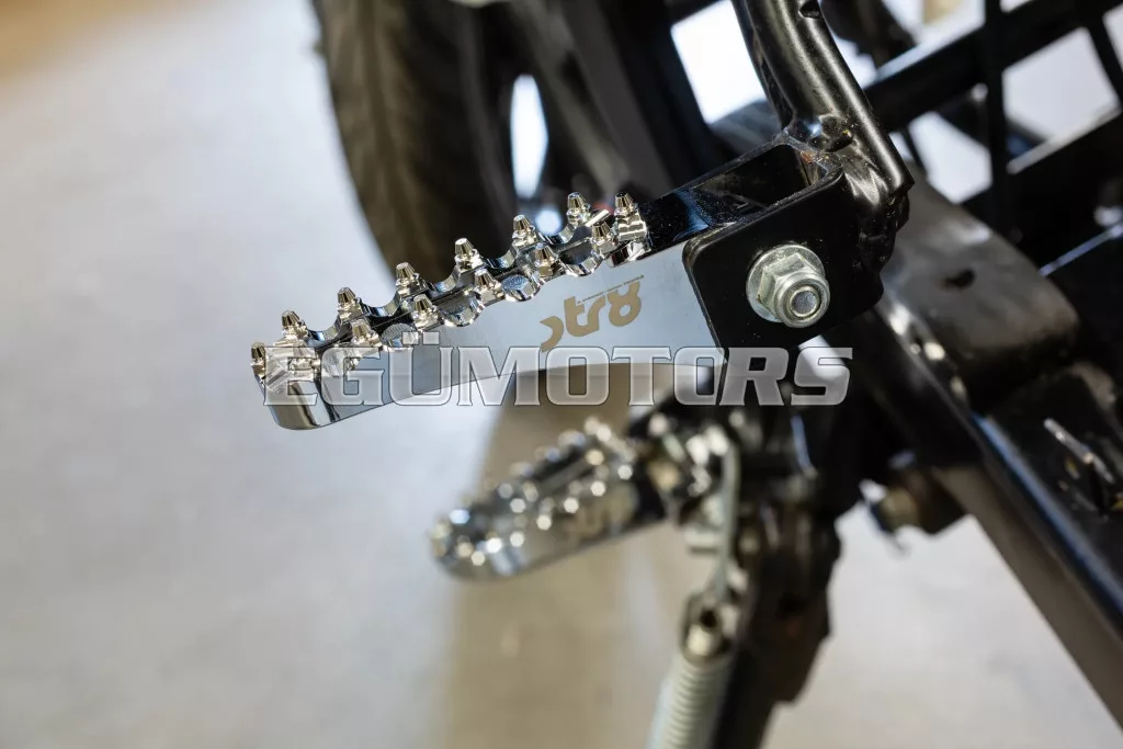 Az éles, motocross stílusú fogak kiváló tapadást biztosítanak, és érezhetően jobb tartást adnak a gyári lábtartókhoz képest, ideális sportos motorozáshoz.
