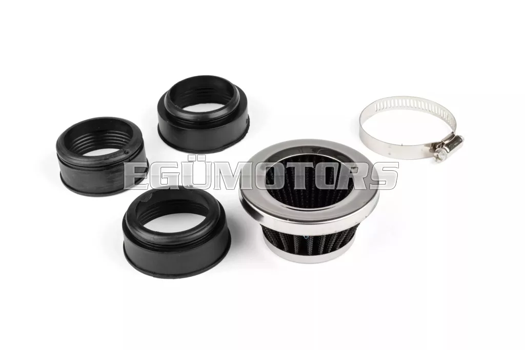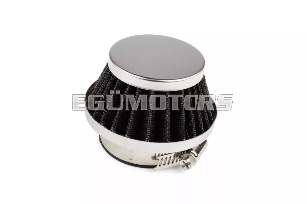 Nyitott tuning légszűrő, KN típus, rövid kivitel, fekete, krómozott fedéllel.
