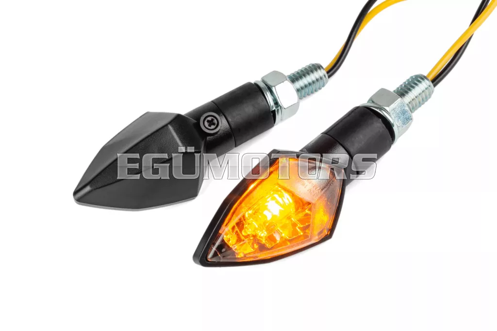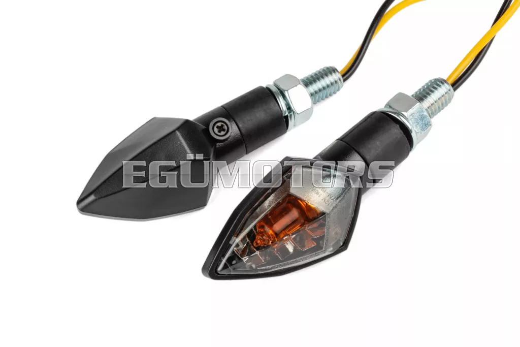 Homologizált STR8 irányjelzők robogókhoz, motorkerékpárokhoz és mopedekhez, a láthatóság, a biztonság és a modern stílus jegyében fejlesztve. A gyémánt formájú kialakítás jellegzetes és stílusos megjelenést biztosít.