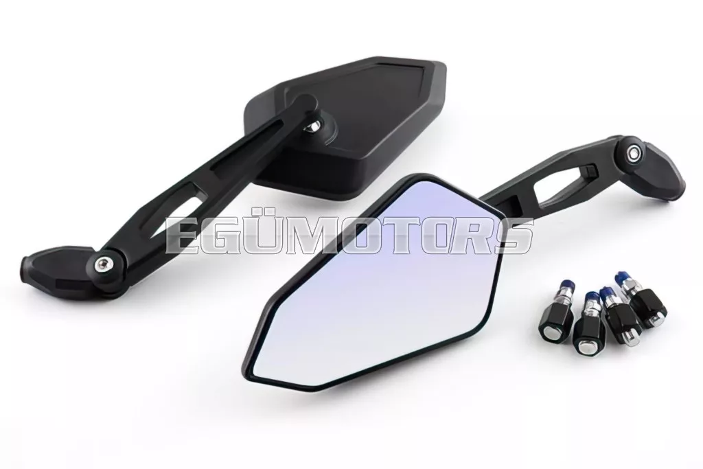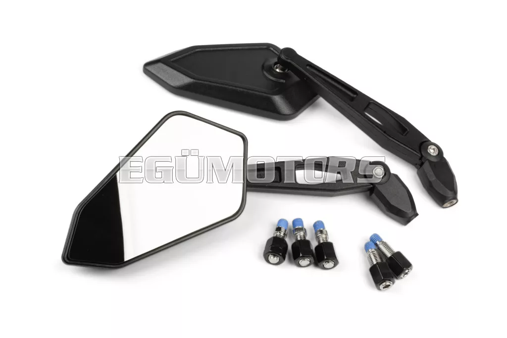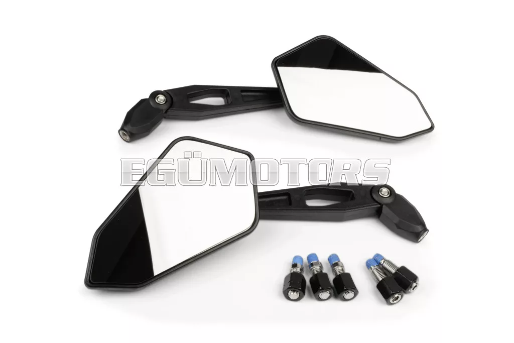 A két csukló révén a tükrök egyedileg állíthatók, és a mellékelt M8 és M10 adaptereknek köszönhetően szinte bármely kétkerekűre felszerelhetők.