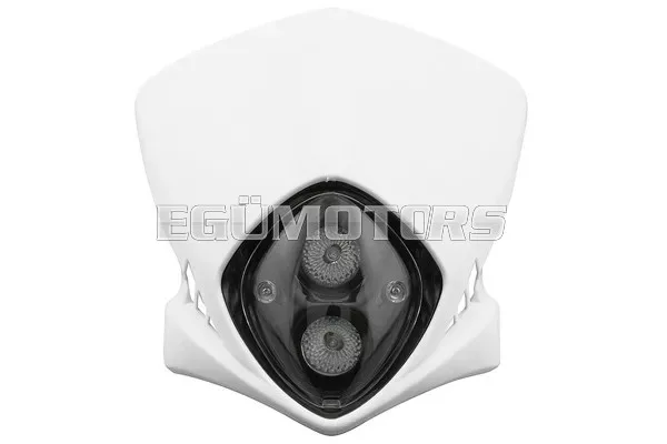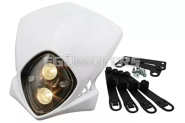 Fényszóró Enduro Duke, fehér, 50cc-es robogókhoz, halogén izzókkal és szerelési tartozékokkal együtt.