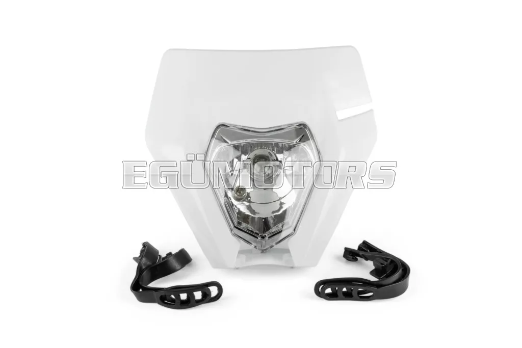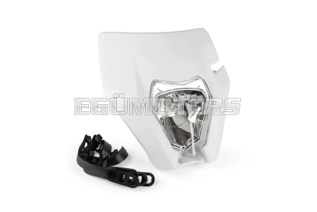 Első fényszóró KTM EXC típus, fehér, 2020 utáni modellekhez, felszerelhető 50cc-es motorokra, supermoto és enduro motorokra, illetve egyéb kétkerekű járművekre.