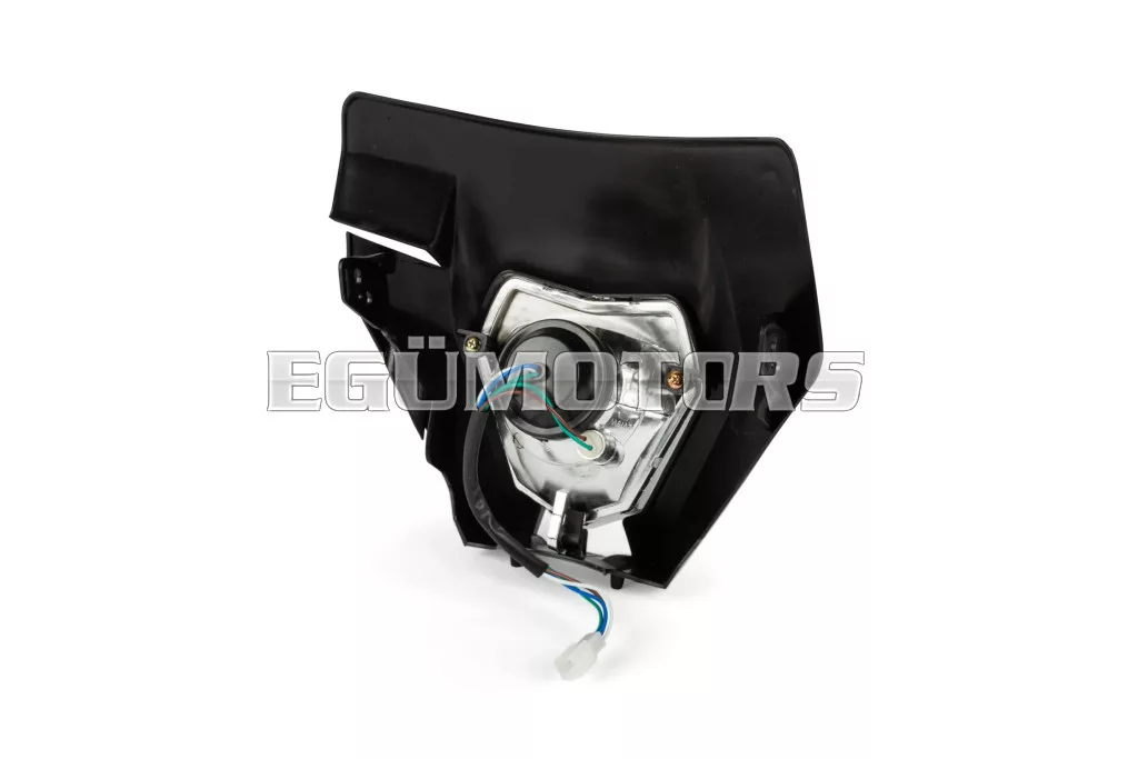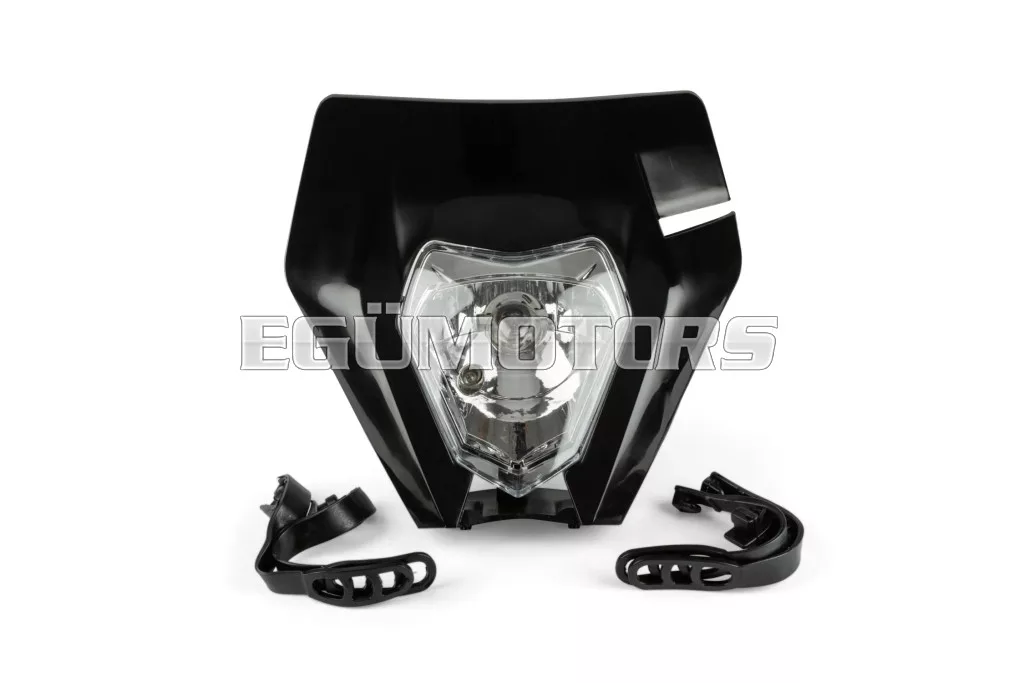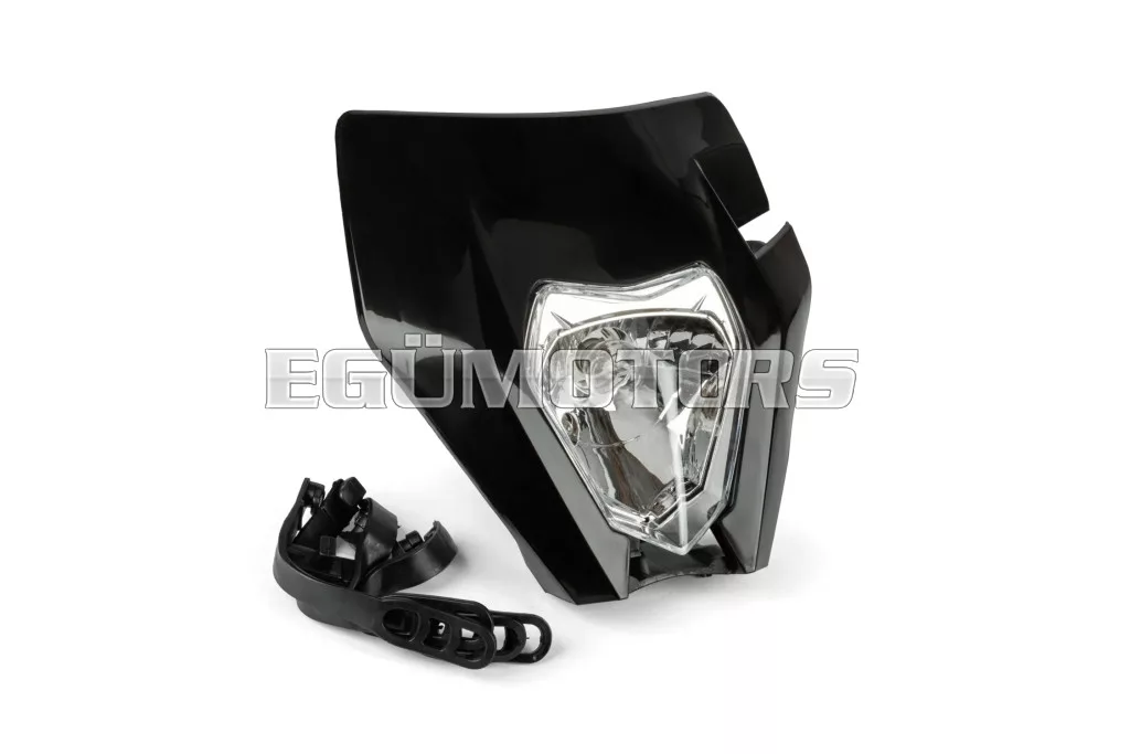 Első fényszóró KTM EXC típus, fekete, 2020 utáni modellekhez, felszerelhető 50cc-es motorokra, supermoto és enduro motorokra, illetve egyéb kétkerekű járművekre.